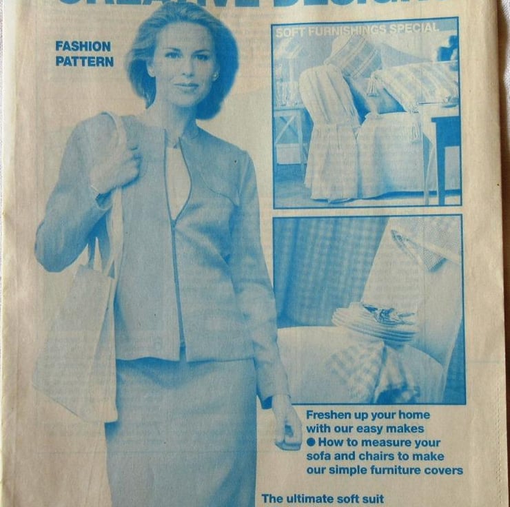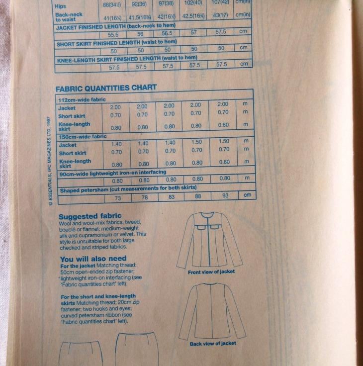A multi-size sewing pattern for a woman's soft suit in sizes 10 - 18 (bust 32.5"/83 cm - 40"/102 cm, Essentials E116). The suit comprises a zip-up, long-sleeved jacket with mock pocket flaps and a slim skirt in two lengths: short and knee-length. The pattern sheet also includes instructions on how to measure a chair and sofa to make furniture covers, athough there are no further details for this project. The pattern is dated February 1997.