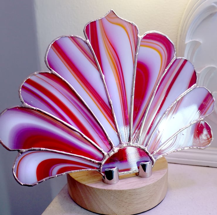 This glass is called Strawberries and Cream and is a layered technique that produces these gorgeous swirls. The fan lamp is styled in the Art Nouveau theme and when lit the lamp changes character by giving off a deep crimson illumination.