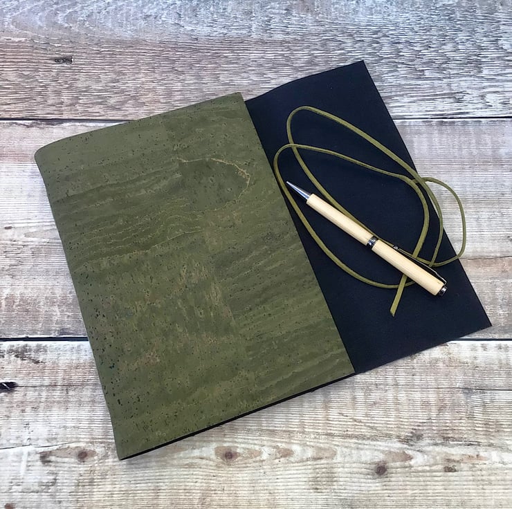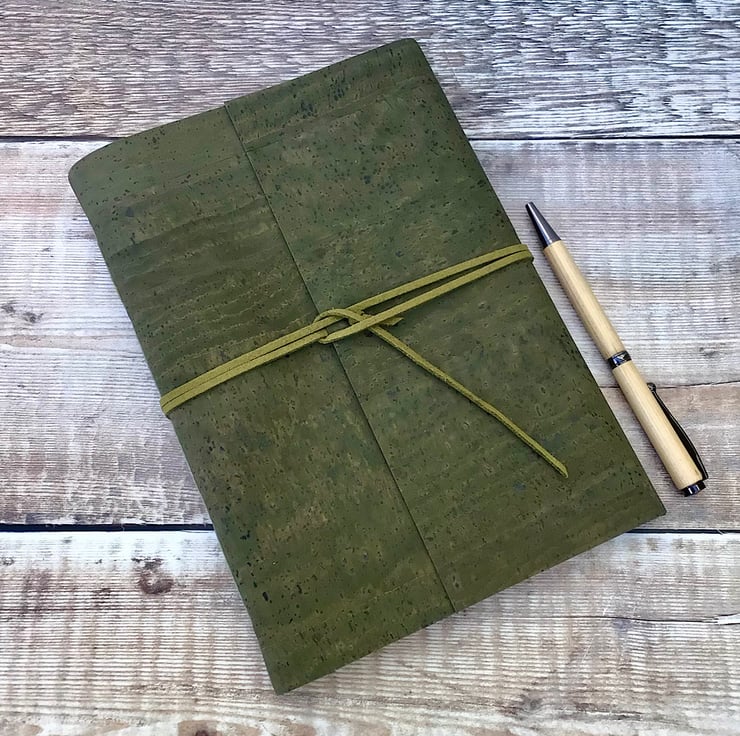 An A5 cork journal notebook in a deep olive green, handcrafted with sustainably harvested cork. It’s also ideal as a sketchbook, planner, diary and wellness journal.