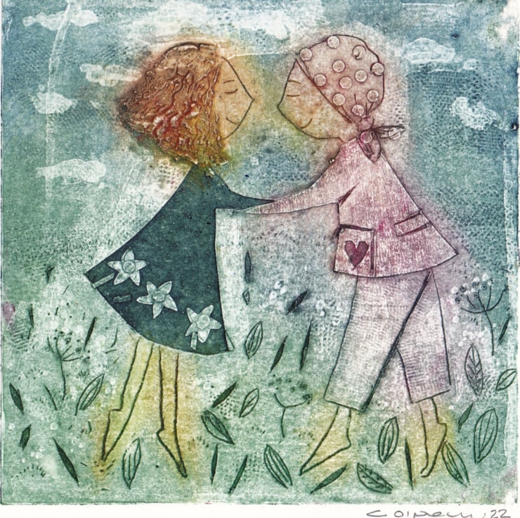 The inspiration for this little collagraph print is friendship and the warmth you feel when you meet someone who you haven't seen for a while. The joy of having a good chat.