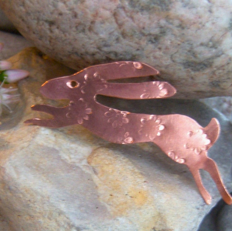 A leaping hare cut from copper sheet and imprinted with random flowers. Approximately 5.5cms long from the end of the nose to the tip of the toes. Sterling silver brooch fastener.