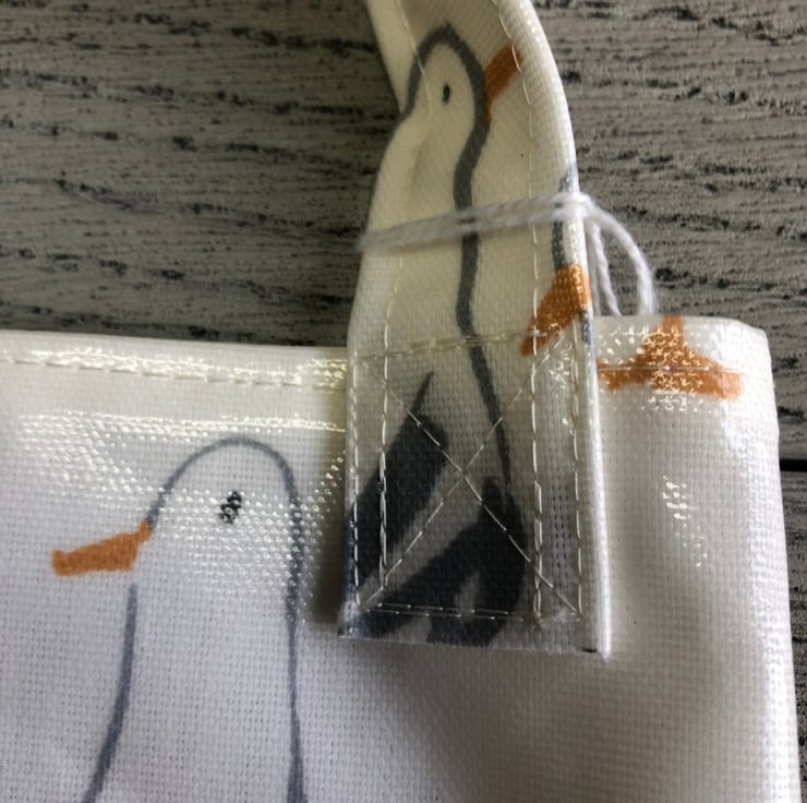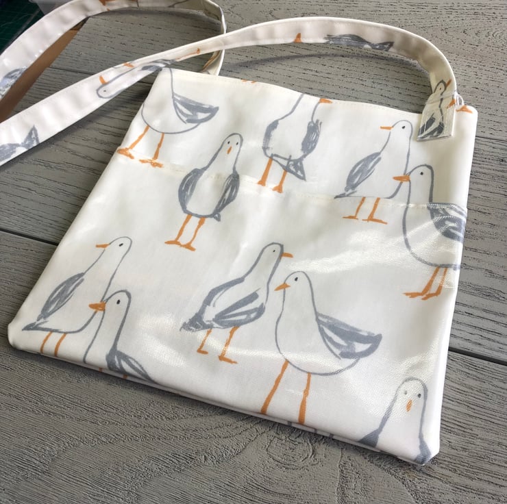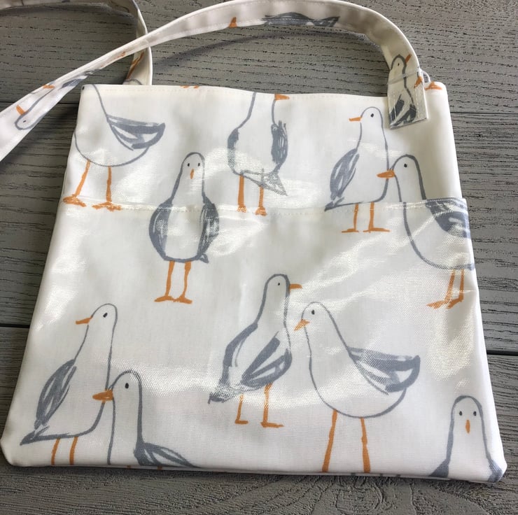 This fun peg bag is made from a white PVC cotton with a design of seagulls in shades of grey and orange. It is unlined.