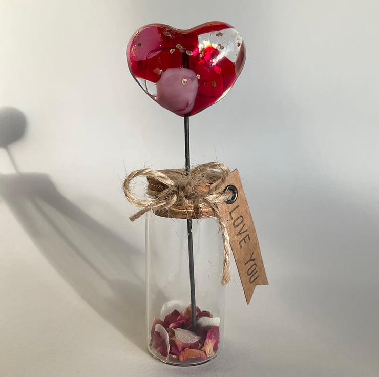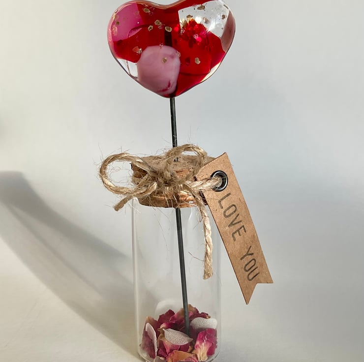This heart comes with a wire stem set into a cork and displayed in a test tube vase, with dried petals and love you tag.