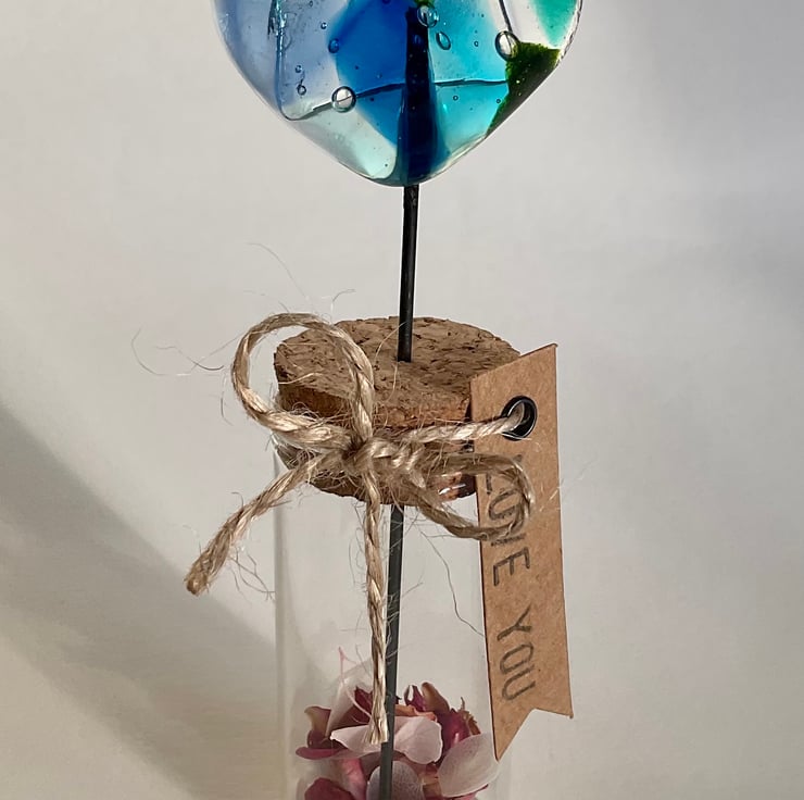 This heart comes with a wire stem set into a cork and displayed in a test tube vase, with dried petals and love you tag.
