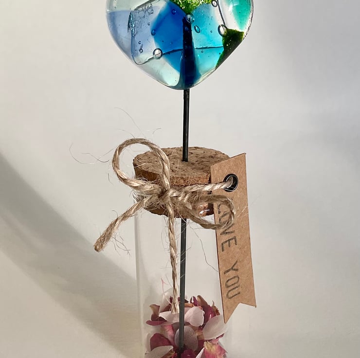 Handmade fused glass heart with a wire stem in a simple glass test tube vase. This is made from handcut glass fused together in a kiln making each one unique. Looks really beautiful in the light, would make an ideal gift for a loved one.