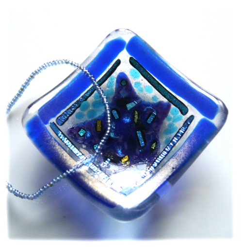 I've added a plump blue star decorated with dichroic for interest and glitter and filled the surround with turquoise frit. I've bordered it with iridescent blue and a line of turquoise dichroic..