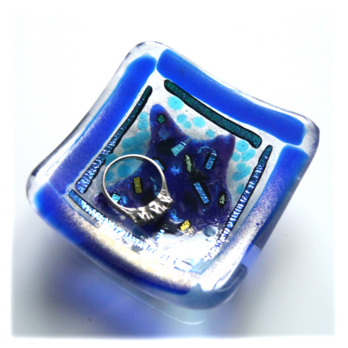 A 7cm square dish, twice fired in my kiln, first to fuse all the glass together, 2nd to slump it over a little mould into a shallow dish shape.