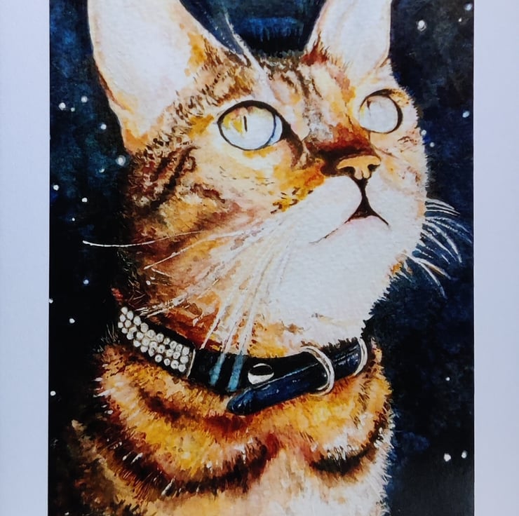 Print of one of a series of original Bengal Cat paintings. Mounted on White Card