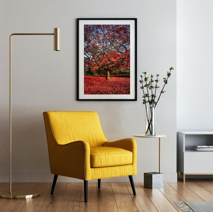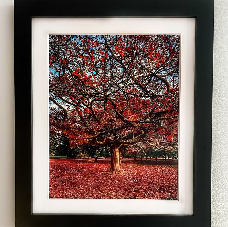 A high-quality 10 x 8in (25 x 20cm) photo of a beautiful red autumnal tree, framed with a white mount and a ready-to-hang or stand black wooden frame.