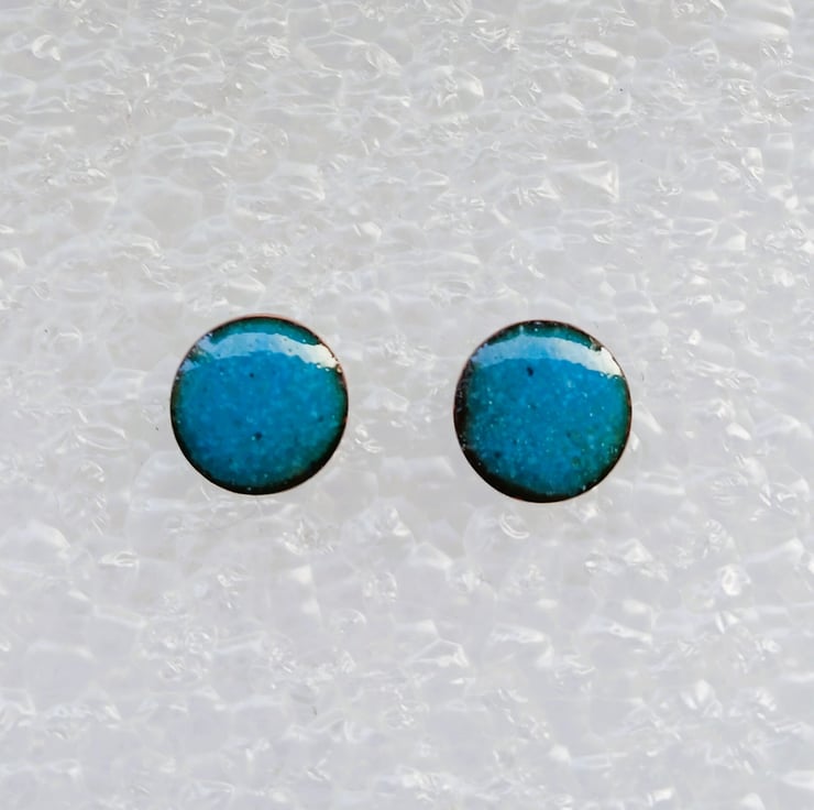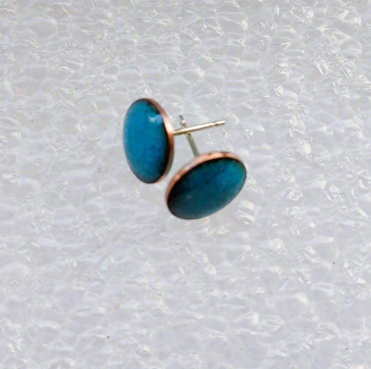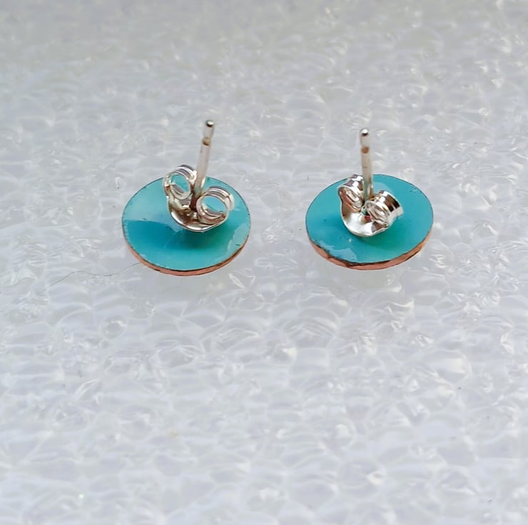 A pair of domed copper stud earrings in rich turquoise. The earrings have been kiln-fired and each measures 10mm in diameter, with sterling silver posts and scrolls (aka butterflies). The backs have been finished in glossy turquoise enamel and they are supplied with a little organza pouch.