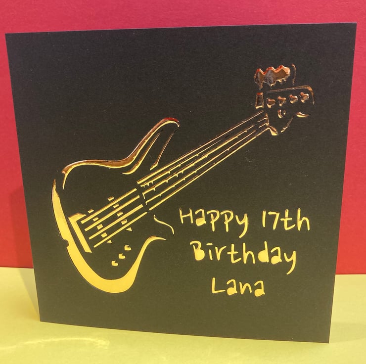 This cleverly designed card has been made by paper cutting a hand drawn bass guitar and sticking gold card behind the image. The gold card has then been hand embossed so it is flush with the card. There is a personalised birthday message on the front.