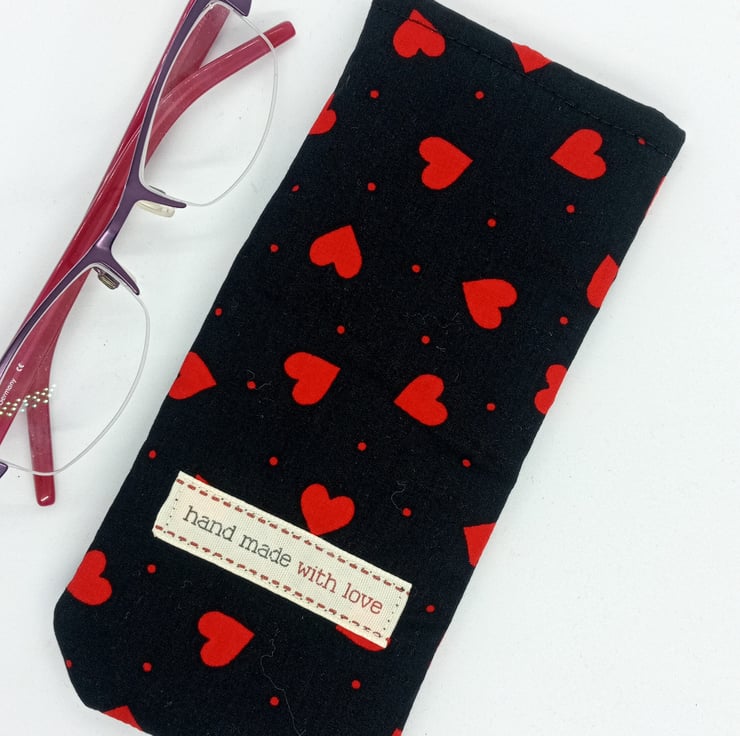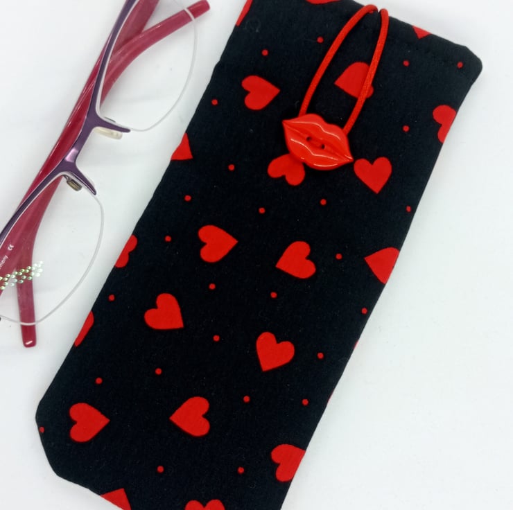 It is wadded to protect your glasses and features a hand made with love label on the back. The lining is bright red cotton and it has a quirky lip shaped button and a loop closure to keep your glasses secure.