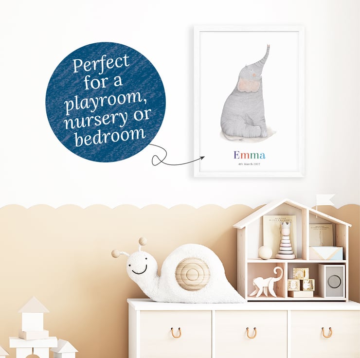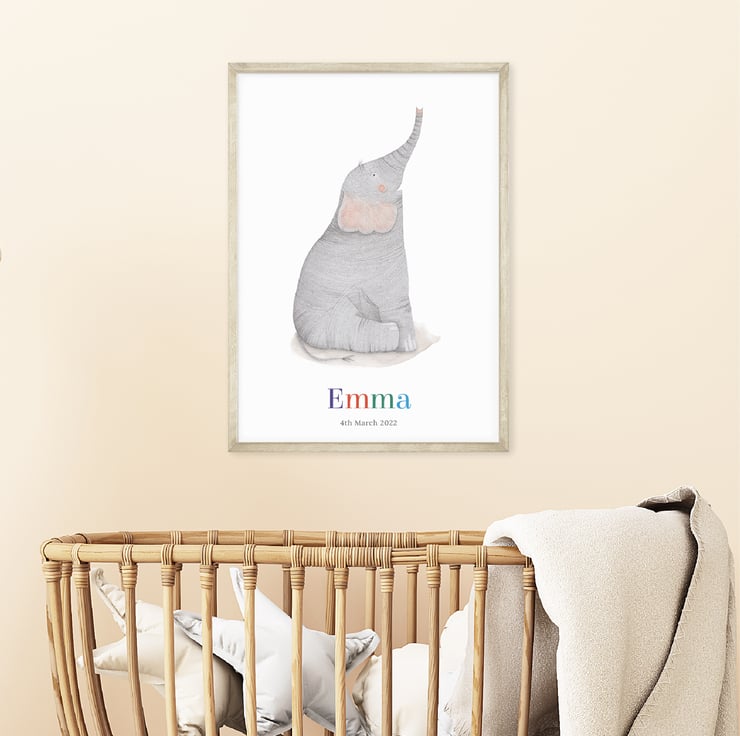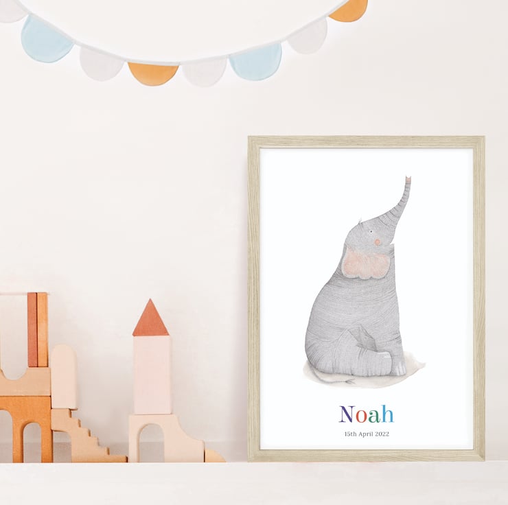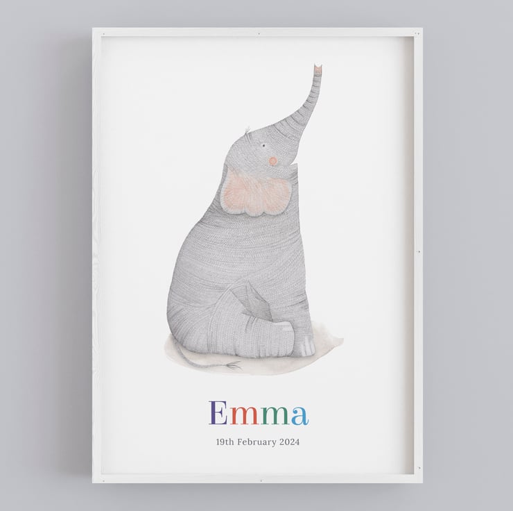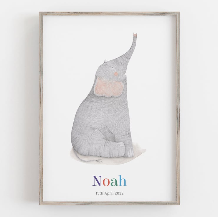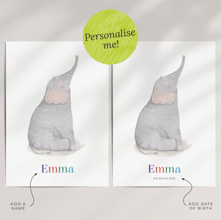 This sweet elephant art print is the perfect gift for a baby. You can customise it with a name and date of birth to make a really special present.