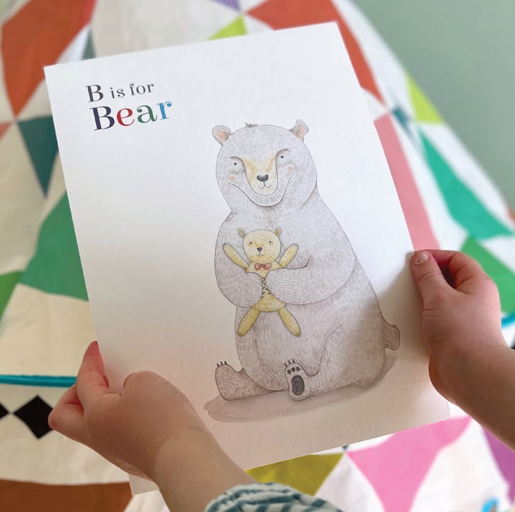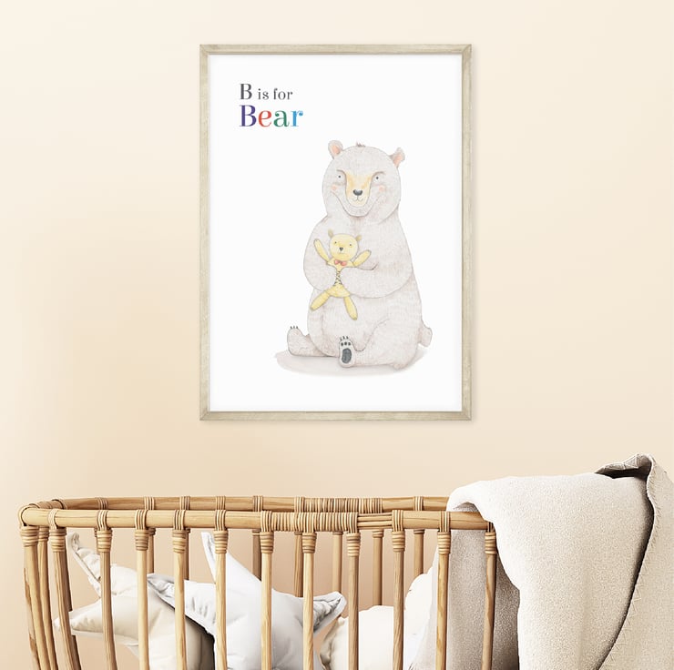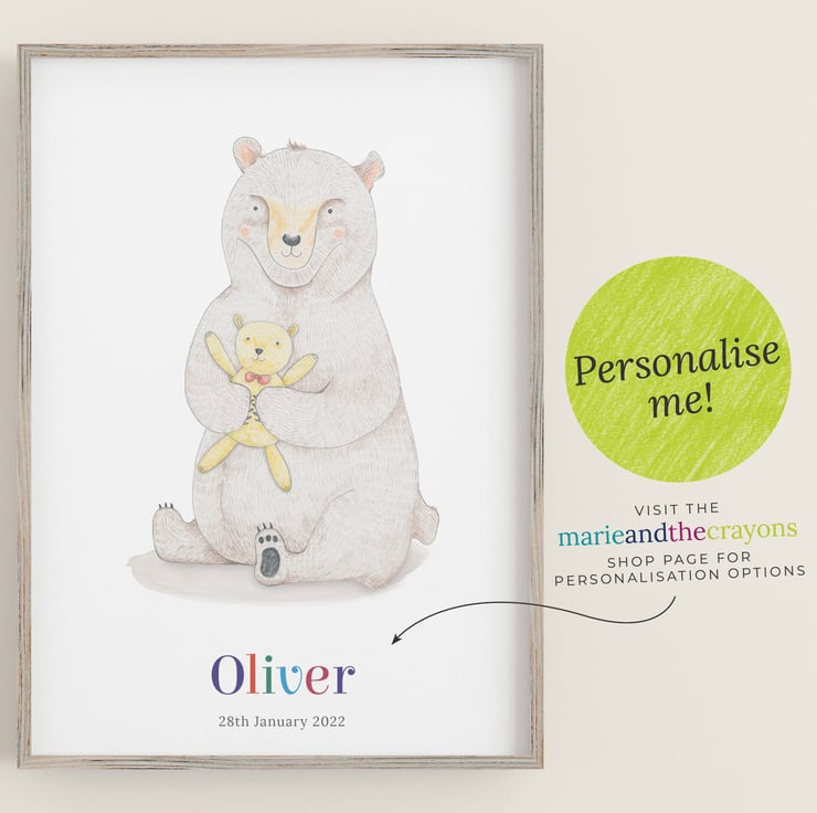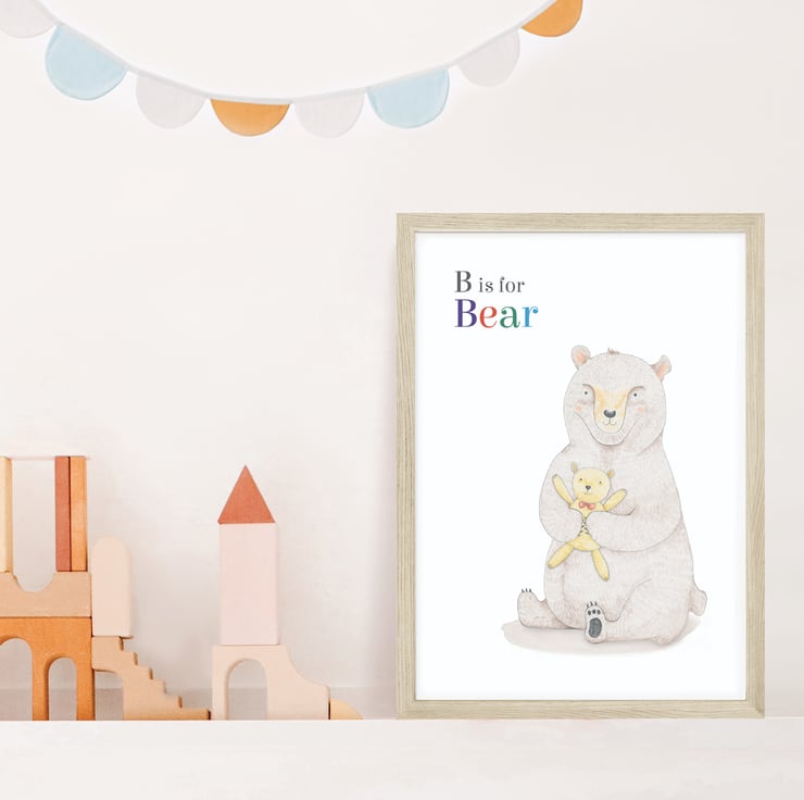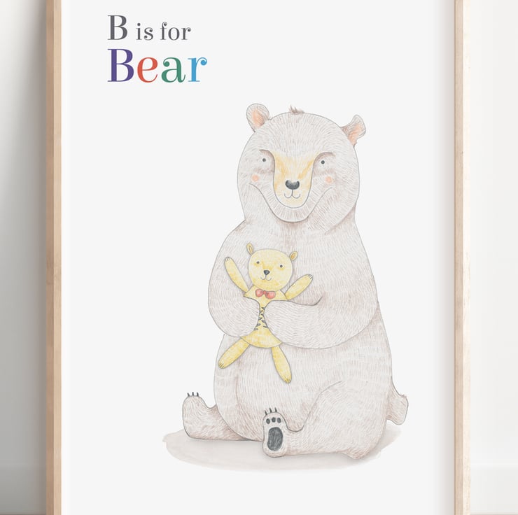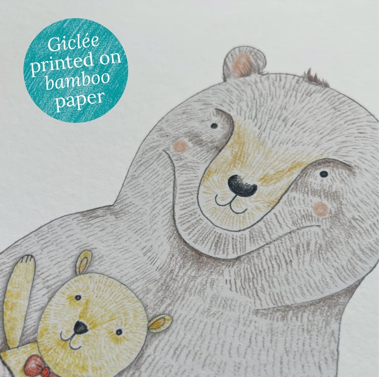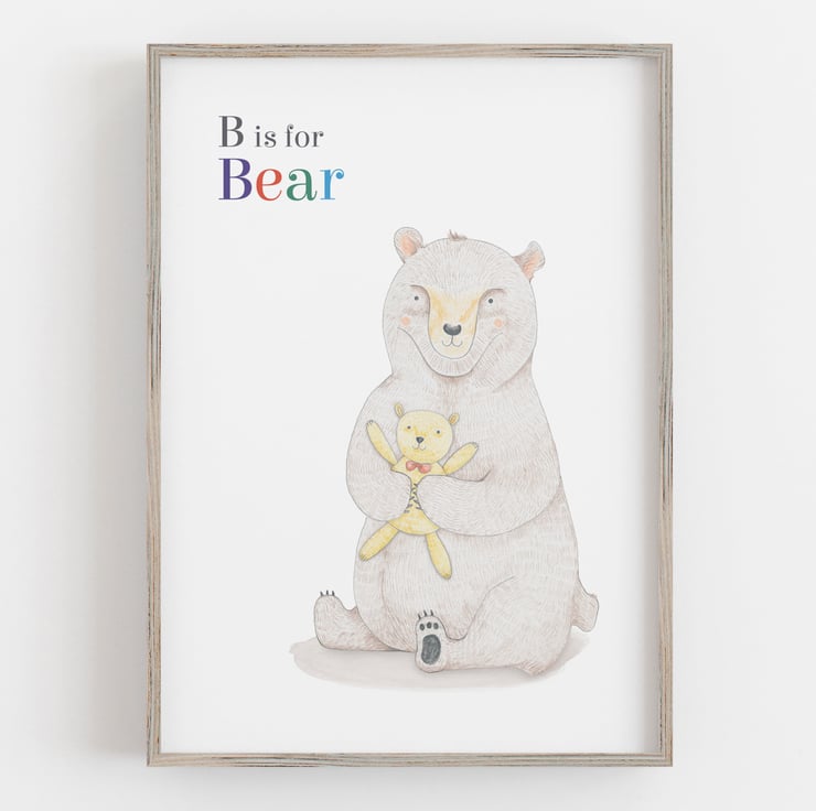 This bear is a bit of a softie really - just look at that teddy being cuddled! This cute bear art will make the perfect finishing touch to a woodland themed nursery or kid's room.