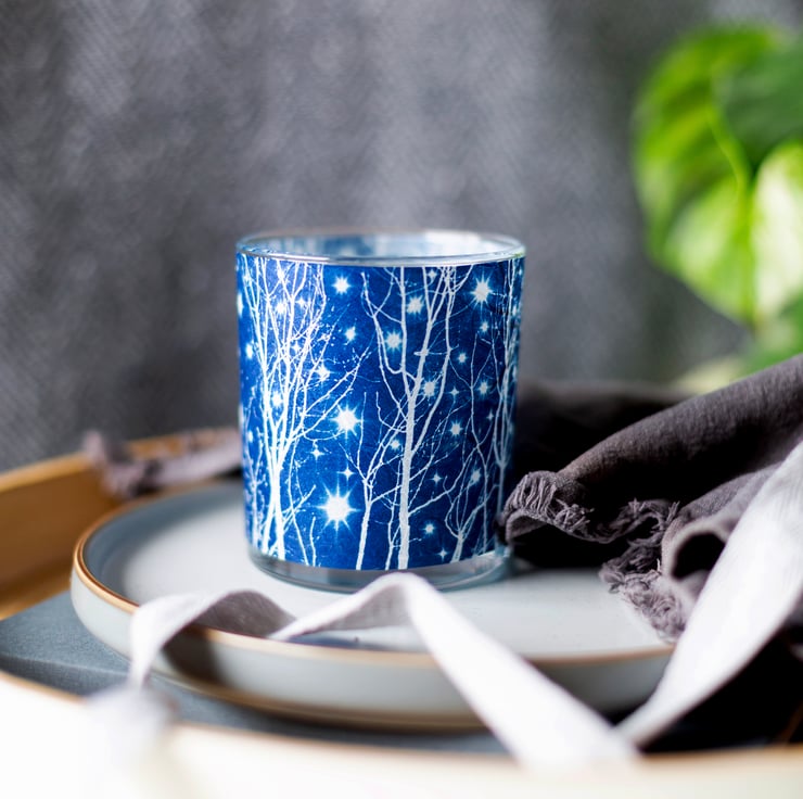 Enchanting tea light holder depicting a deep blue starry night seen through delicate Winter's tree branches. Created by applying a Cyanotype on delicate textured paper to glass.