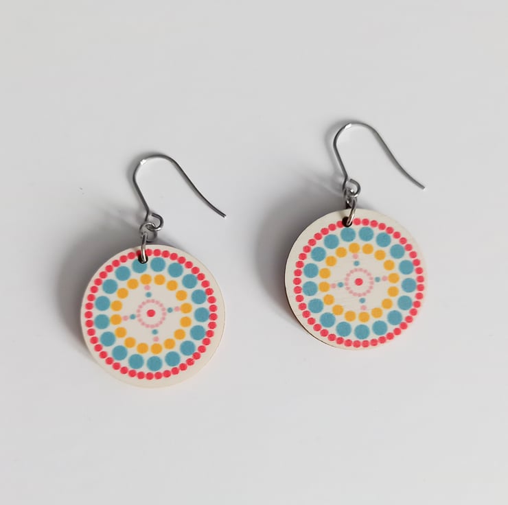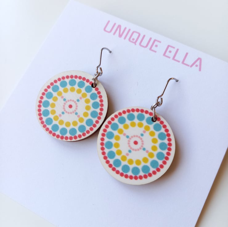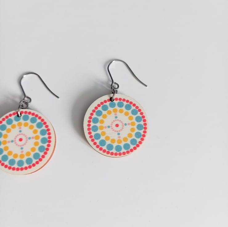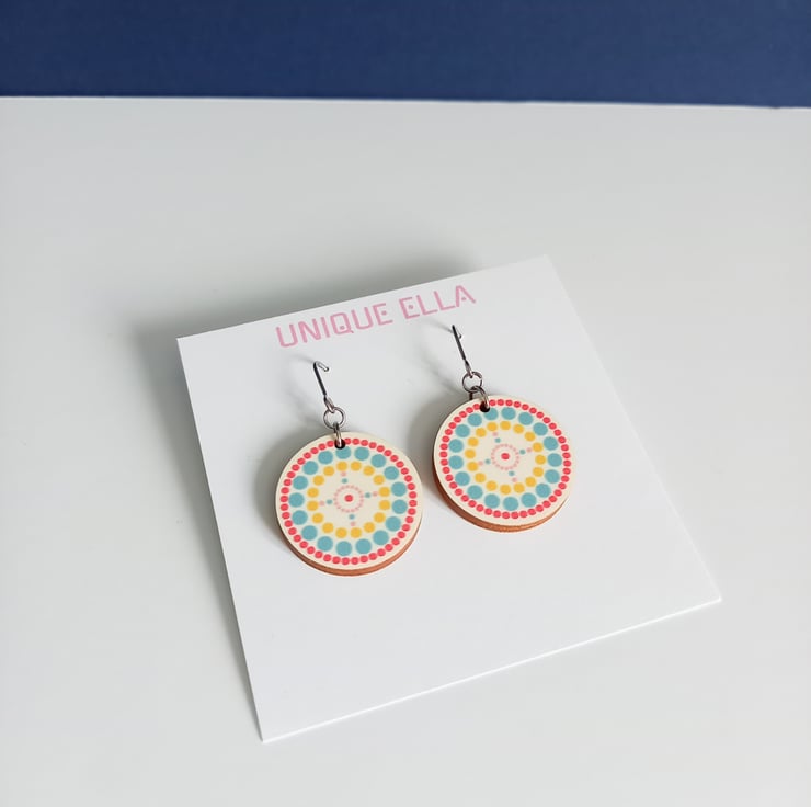 Earrings are laser cut from high quality PEFC & FSC certified Finnish birch plywood. The surface of the wood is printed with ecological printing ink and finished with varnish.