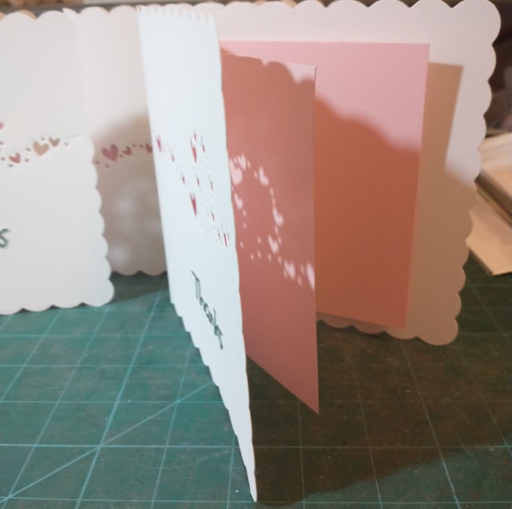 A completely handmade and uniquely designed pack of 3 cards all same design. Consisting of scalloped quality pristine white card which has a romantic heart swirl die cut. The pink insert showing through. Finished off with thanks die cut from silver mirror card