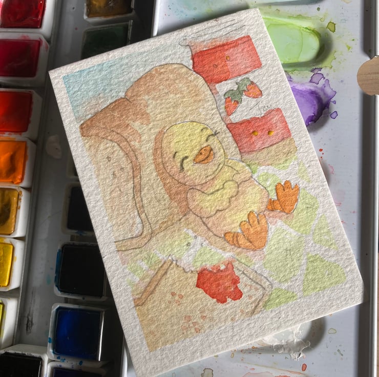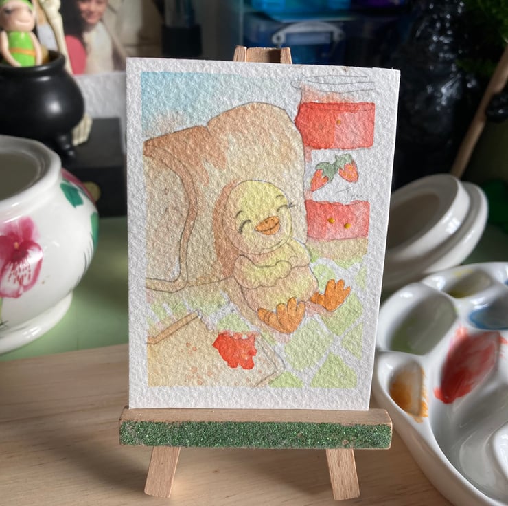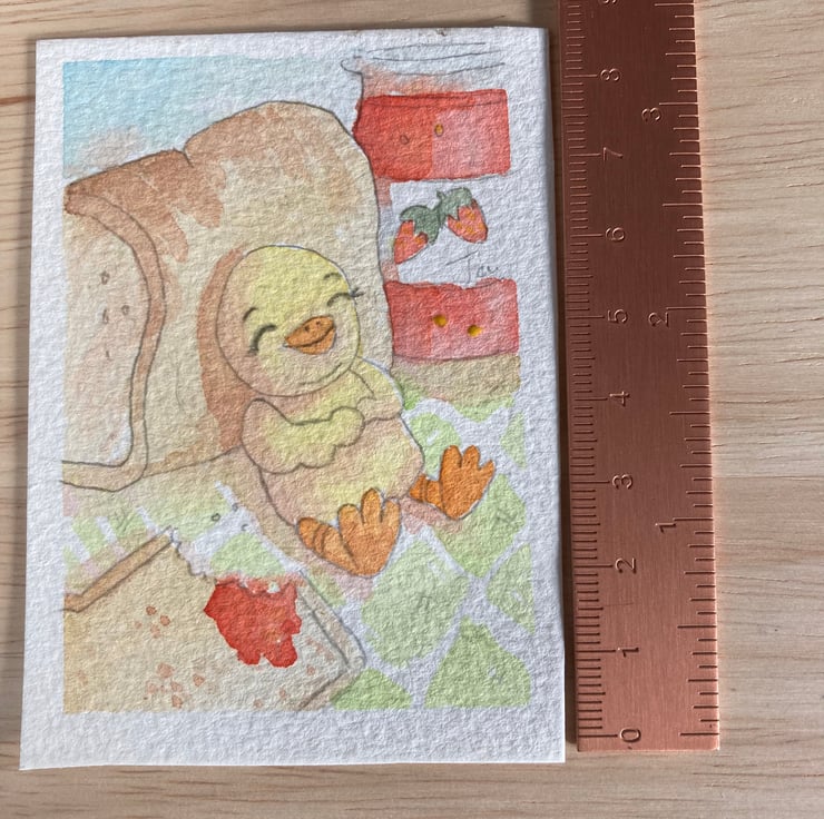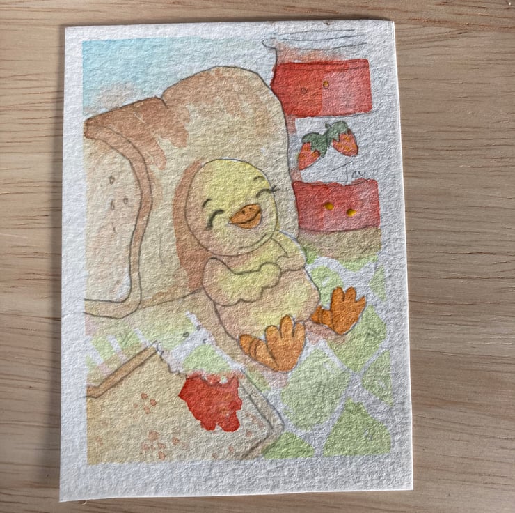 This ACEO is a miniature watercolour illustration of a cheeky chick who has helped herself to a jam sandwich and eaten so much bread and strawberry jam that she needs a good long nap!