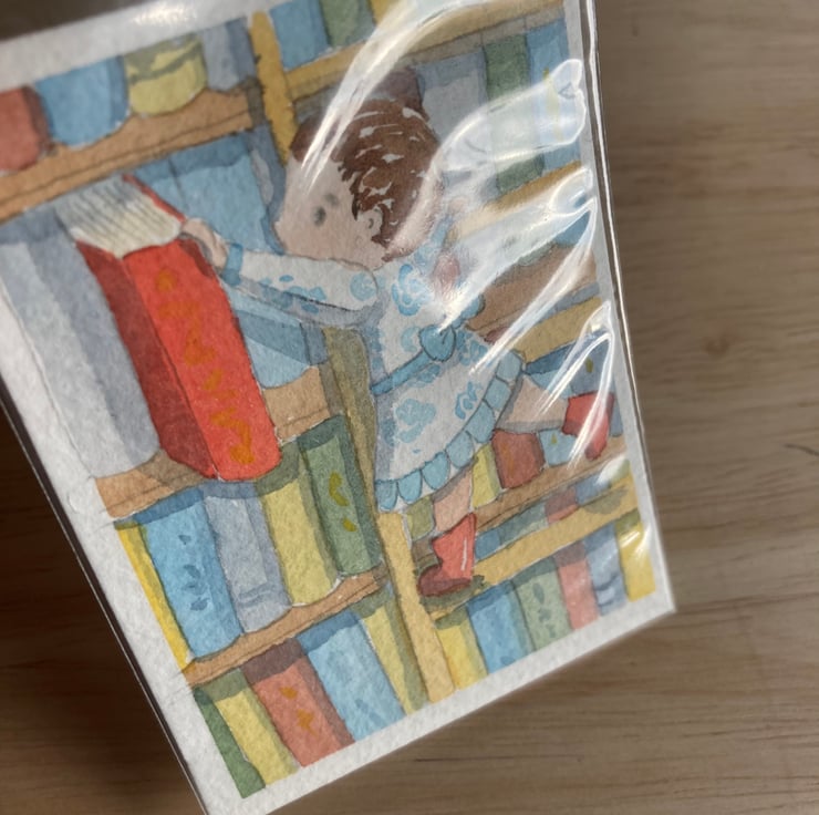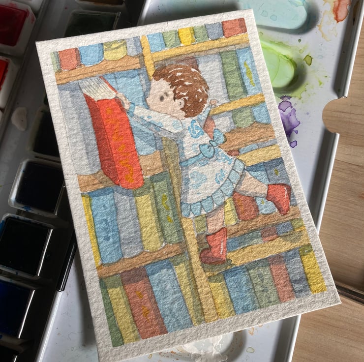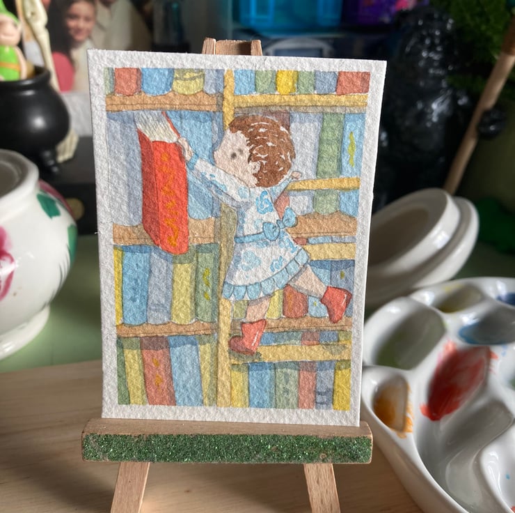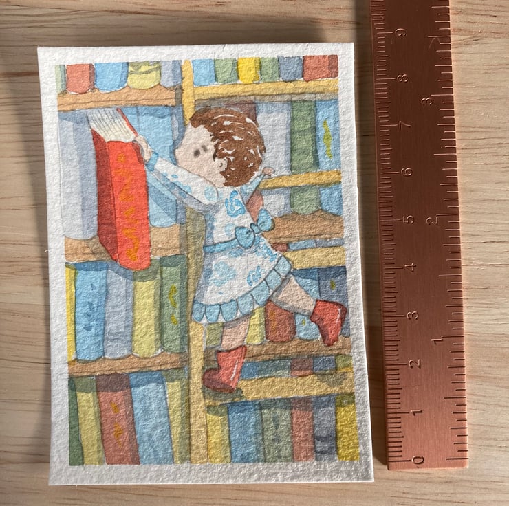 This ACEO is a miniature watercolour illustration of a little girl who loves big books (especially if they have a red cover!) and she is determined to get the one she wants independently!