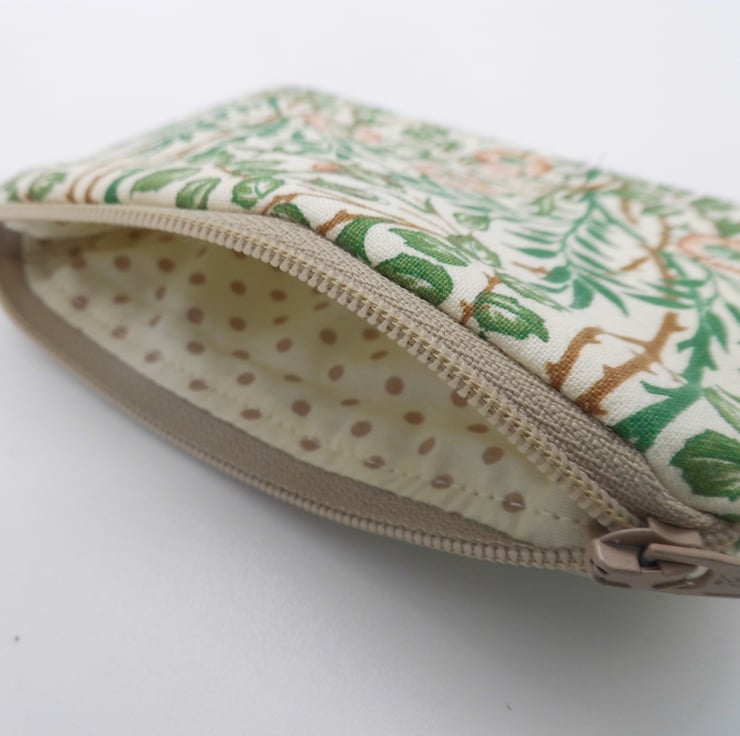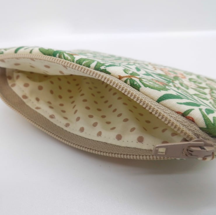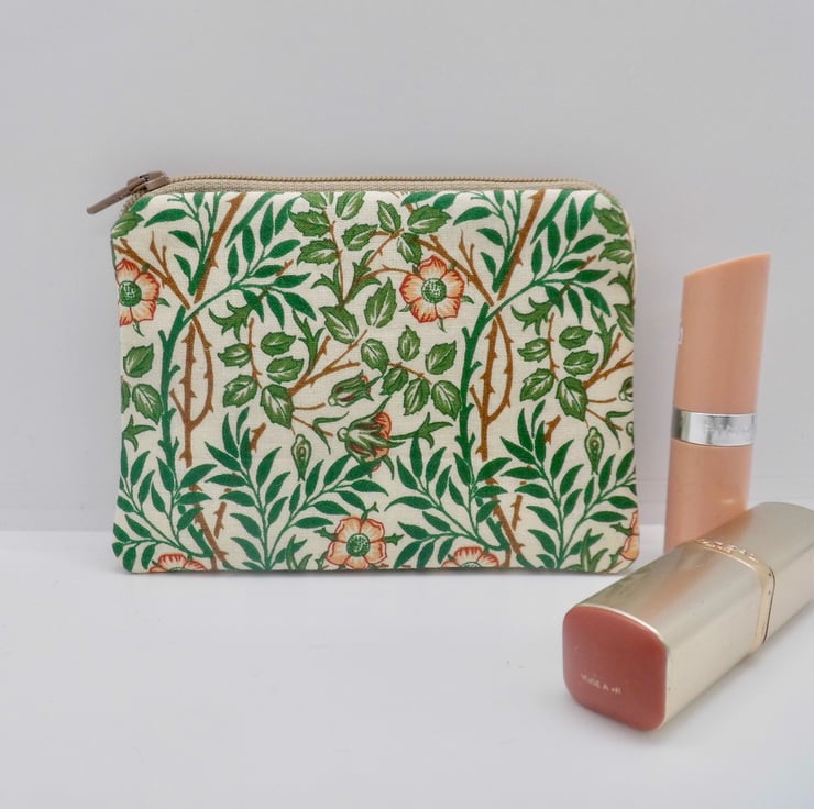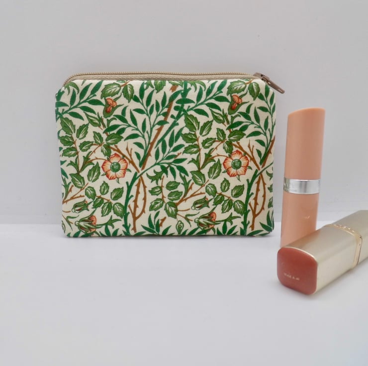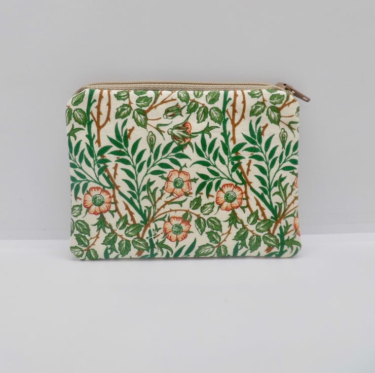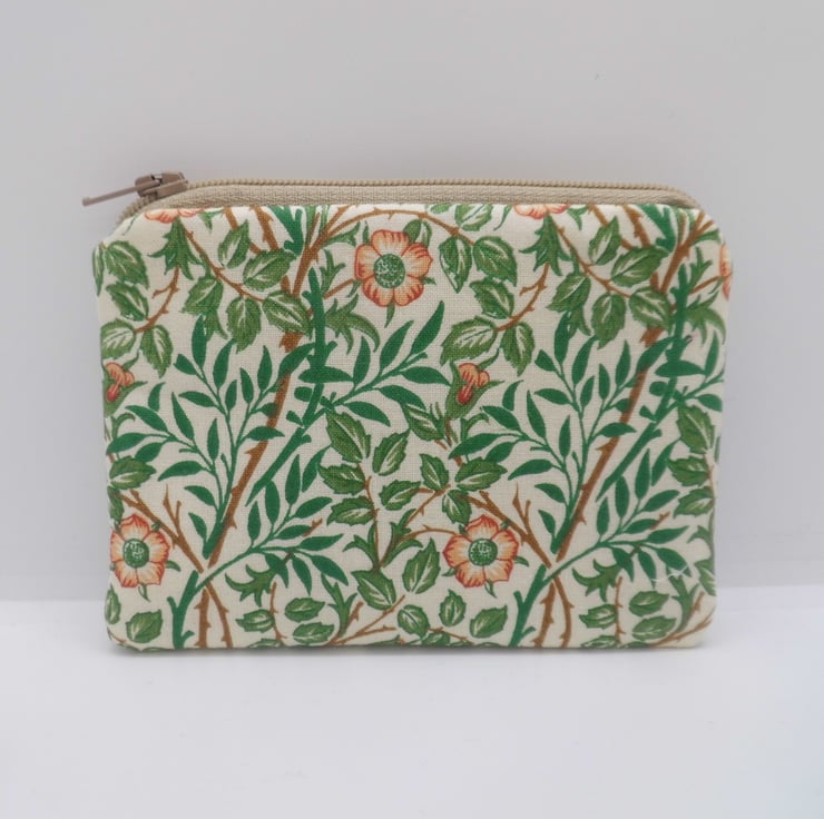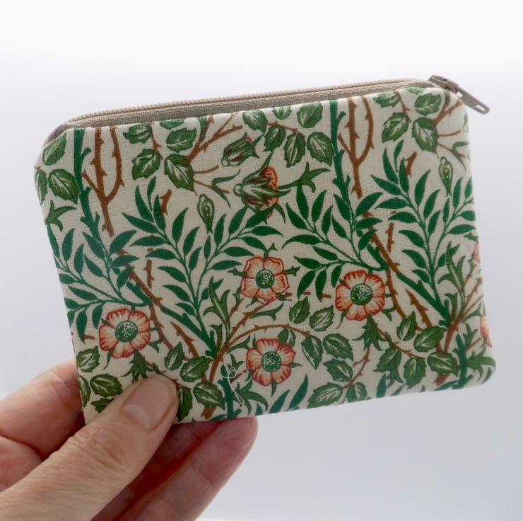 This coin purse is made in William Morris design fabric called Sweet Briar, a lovely print with entwined flowers, leaves and thorny stems. I backed this cotton fabric with fusible fleece for cushioning, stability and a firm texture . Lined with cream and coffee spotted cotton.
