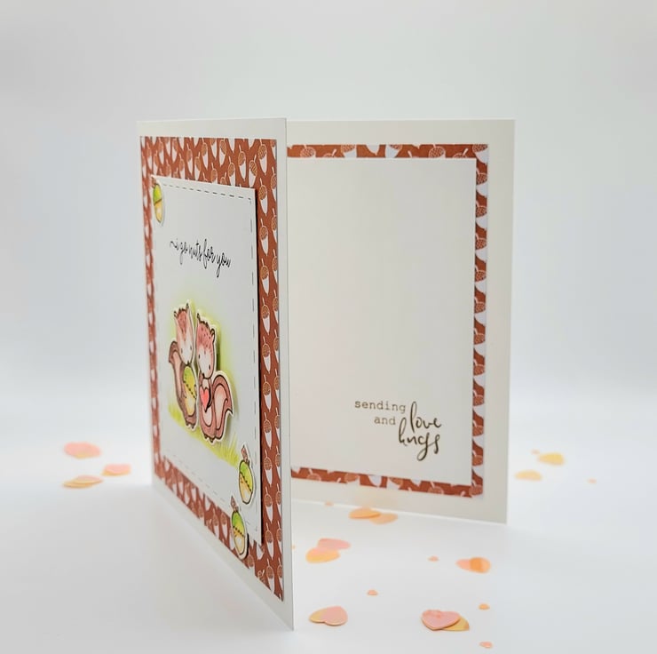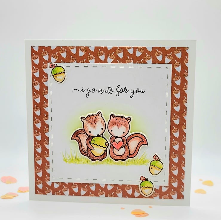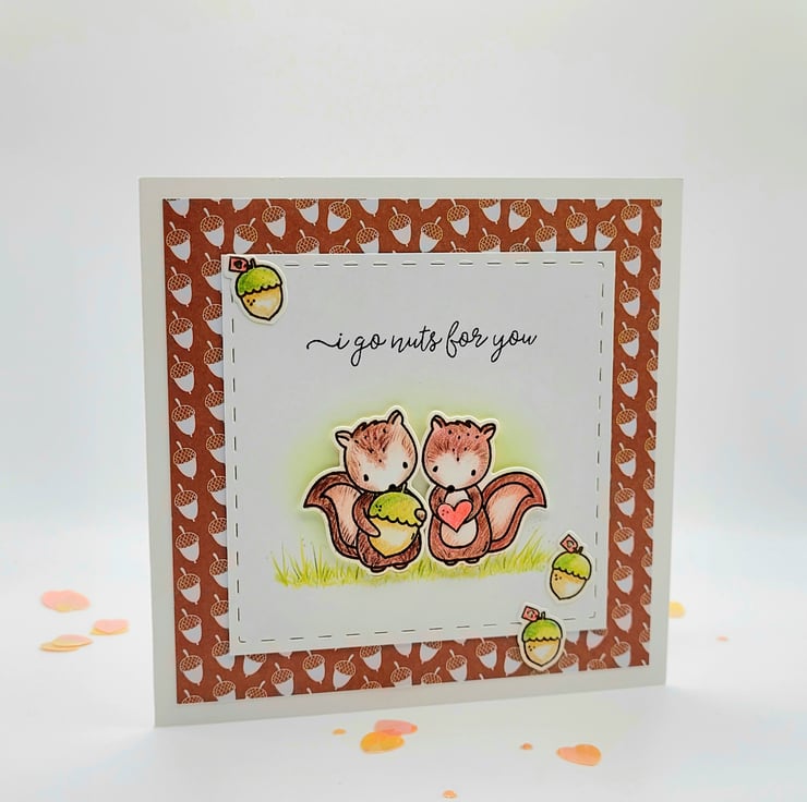The handmade card base is quality white card, with a layer of acorn patterned paper. On top of this is a white faux stitched panel with stamped sentiment. Pale green ink has been blended in the centre of the card and grass drawn with pencils. The squirrels are die cut out and popped up on slim foam for a little dimension. One of the squirrels is carrying a decorative heart and the other an acorn.