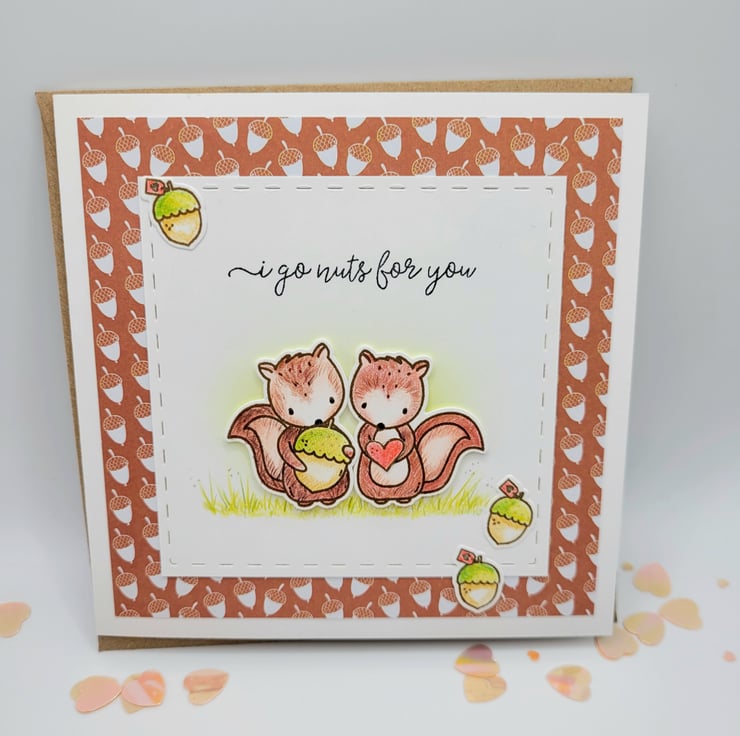 An individually handmade card, featuring two little squirrels and with the fun sentiment 'I GO NUTS FOR YOU'. The card comes supplied with a 100% recycled brown kraft envelope and measures 12.5 x 12.5 cm. Designed and all elements handmade here in my craft room, using quality art materials.