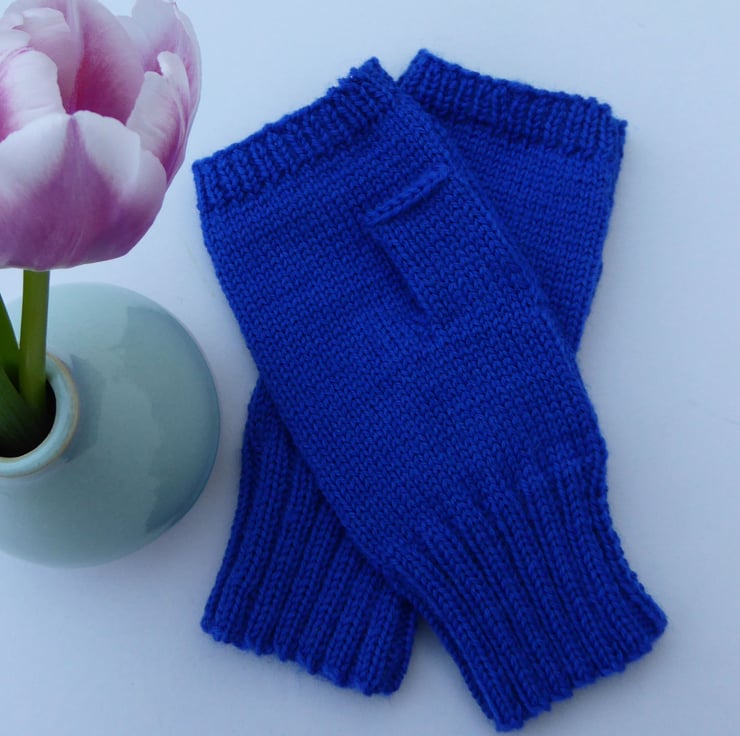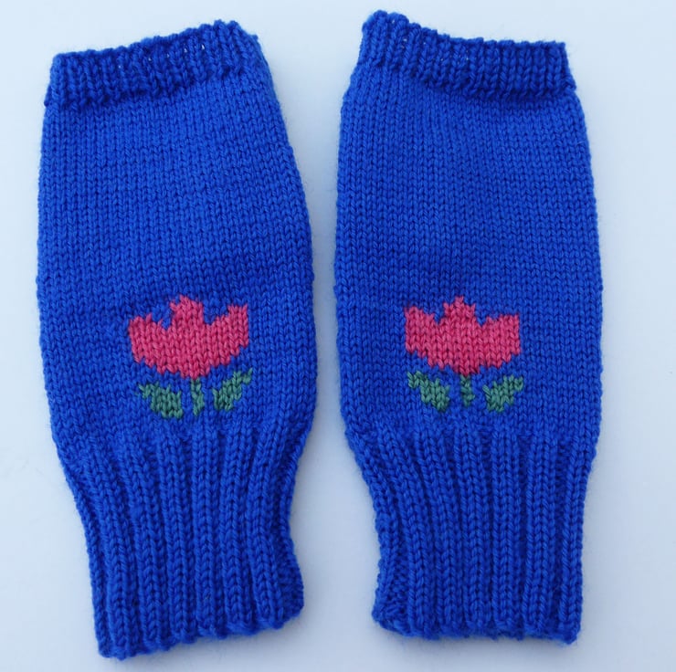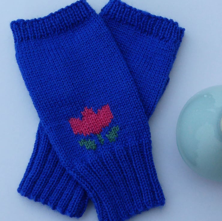 Bright sapphire blue knitted fingerless gloves with a pink Tulip motif, made from merino wool. These hand warmers have been knitted by me on my vintage knitting machine in 4ply wool. They are lovely to wear when painting, crafting, drawing as they keep your hands warm but fingers free to do tasks. Bright, fun and comfy gloves.