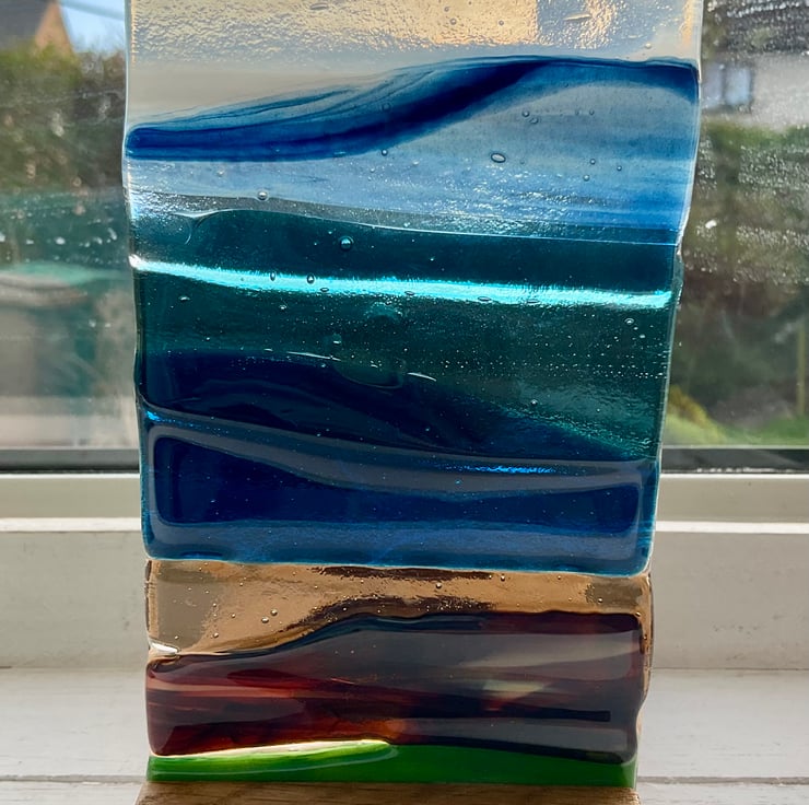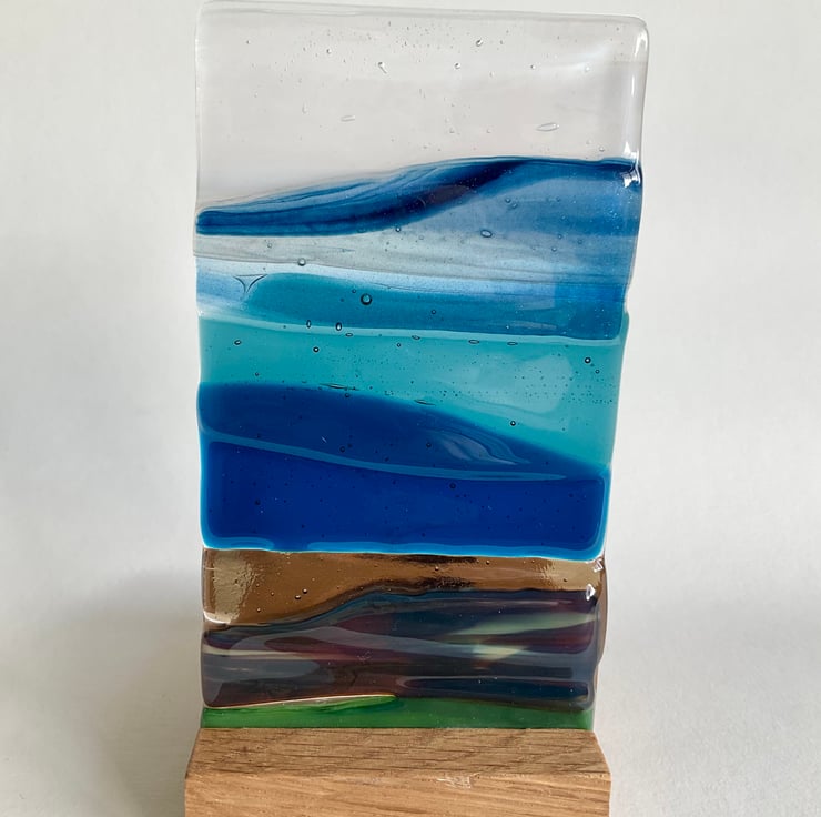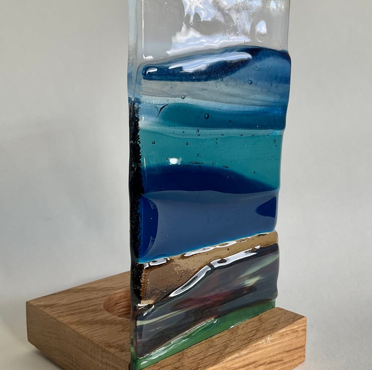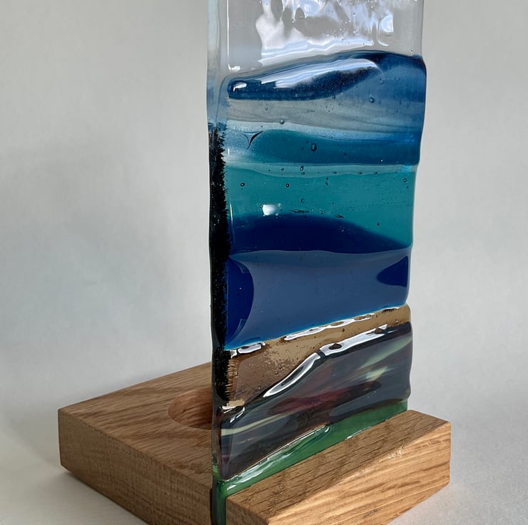 This is a one of a kind handmade fused glass seascape. Each piece of glass is cut by hand and fired in my kiln. It has then been displayed in a solid oak handmade based, which has a recess for a candle. This looks lovely with the light shining through and would make an ideal gift.