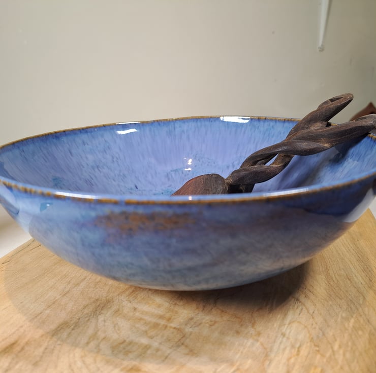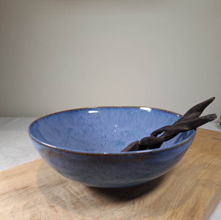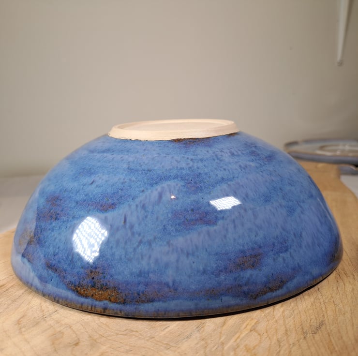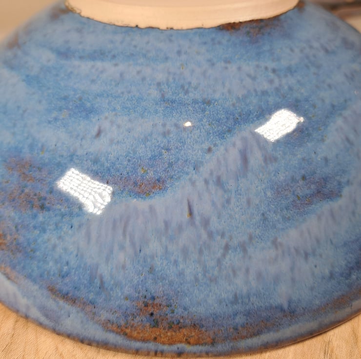 Glazed in a non toxic lavender blue glaze, mottled with darker blue spots and browns around the rim.