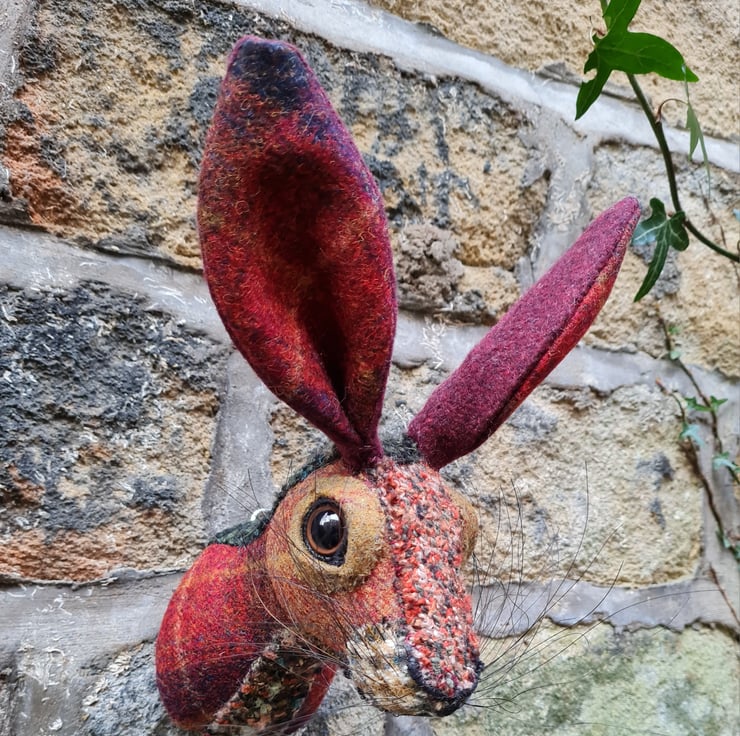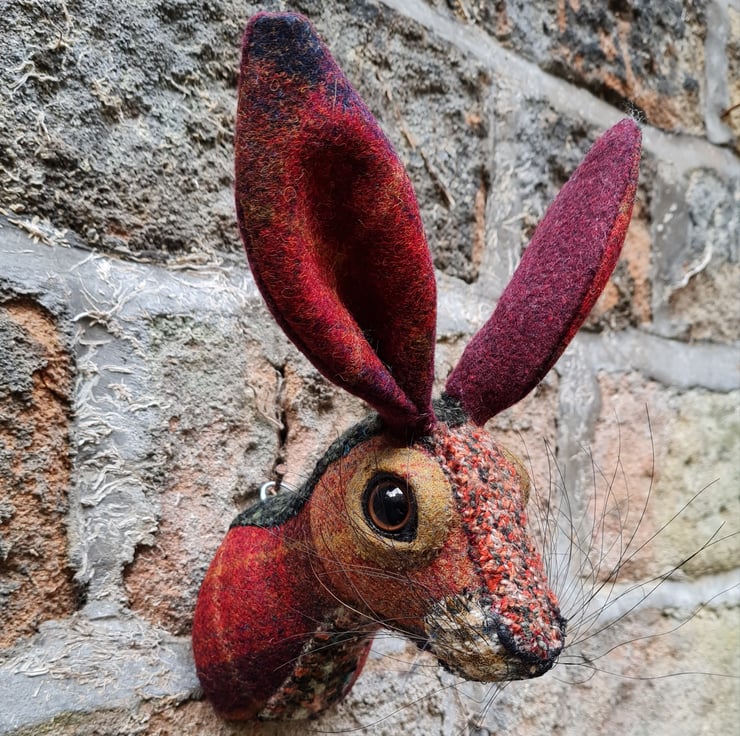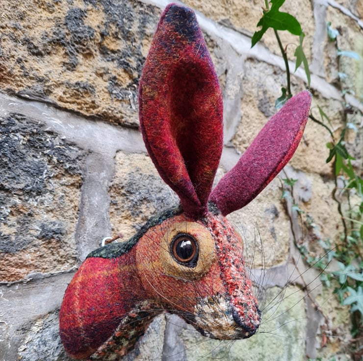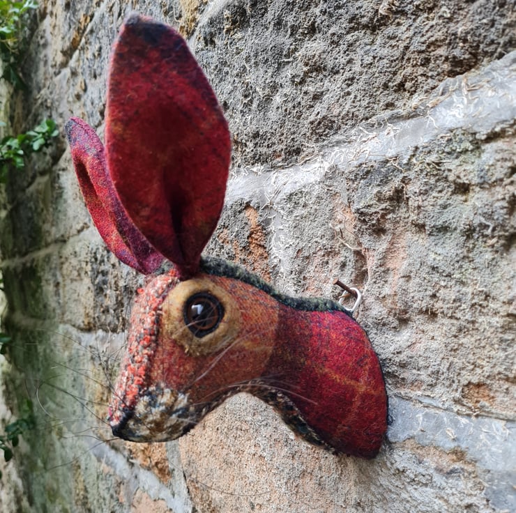 A lifesize faux hare which I have handmade and covered in hand stitched Abraham Moon wool fabric. The head is backed with felt and has a metal hanger to hang it on the wall. It is lightweight.