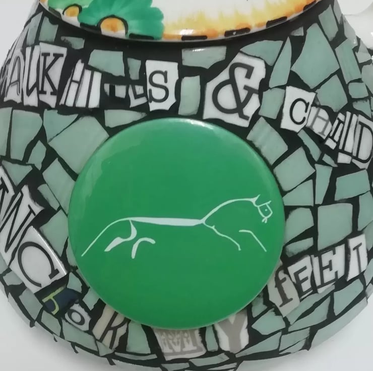 Inspired by the XTC song Chalkhills and children with Uffington White Horse and lyrics Chalkhills and children anchor my feet. Upcycled mosaic teapot