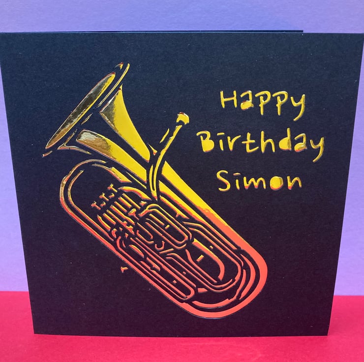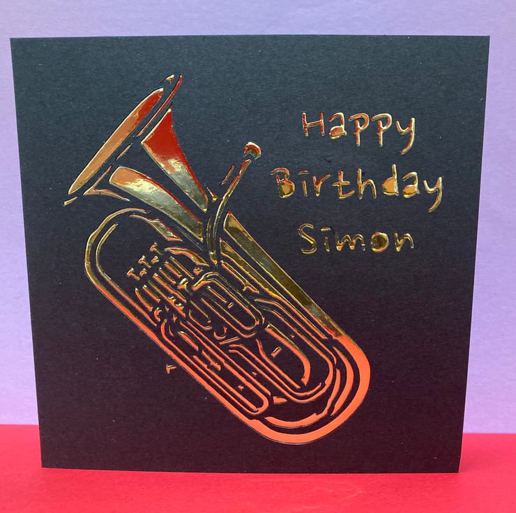 This cleverly designed card has been made by paper cutting a hand drawn euphonium and sticking gold card behind the image. The gold card has then been hand embossed so it is flush with the card. There is a personalised message on the front.