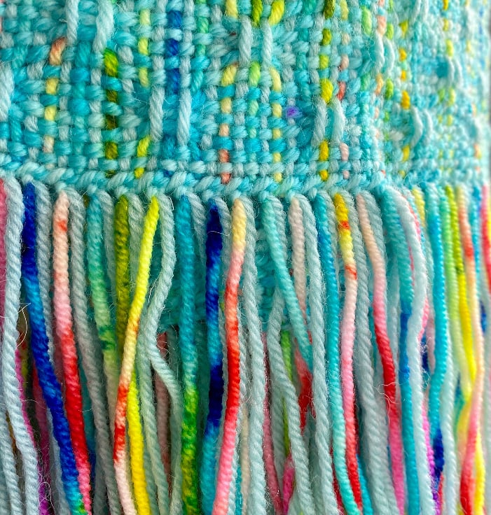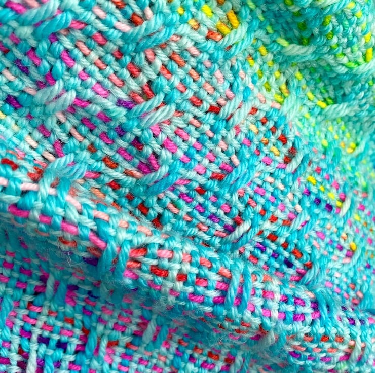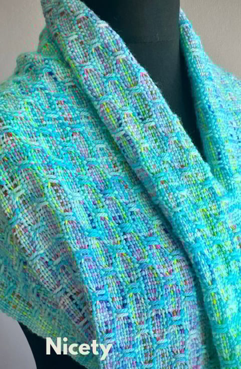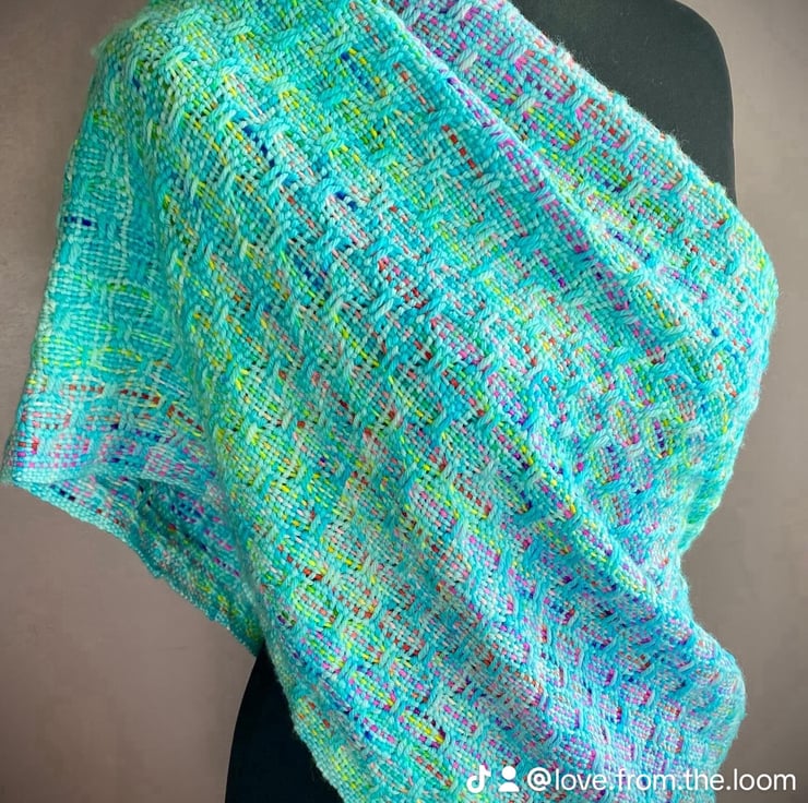 Gloriously textured wrap with radiant rainbow shades flashing through the soft aqua wool.