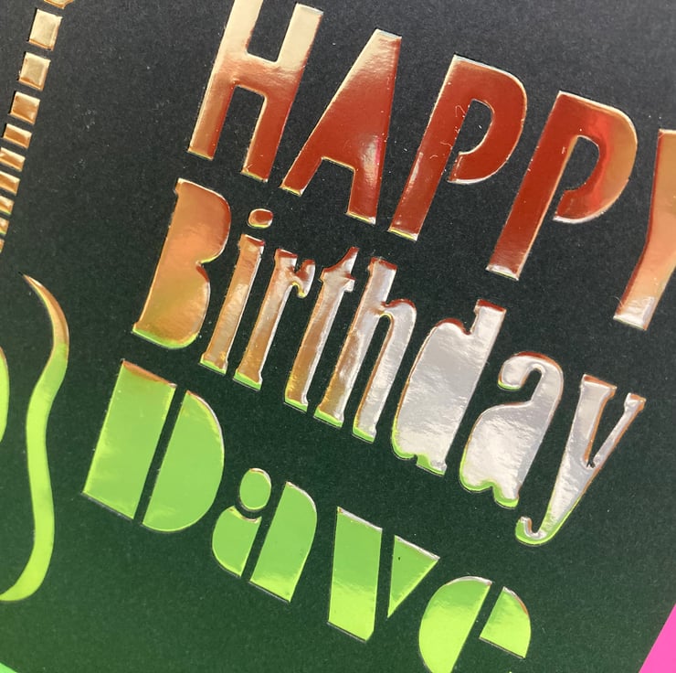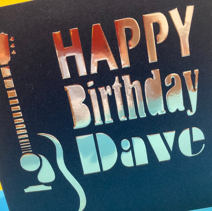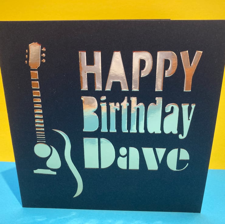 This cleverly designed card has been made by paper cutting a simple illustration of a guitar with a personalised message in big bold gold text.