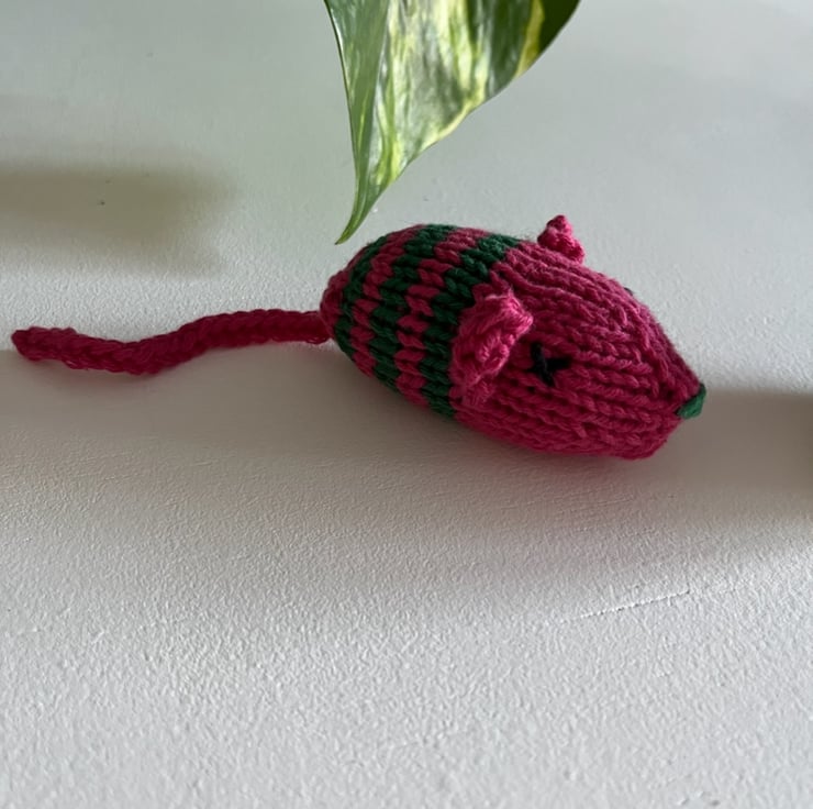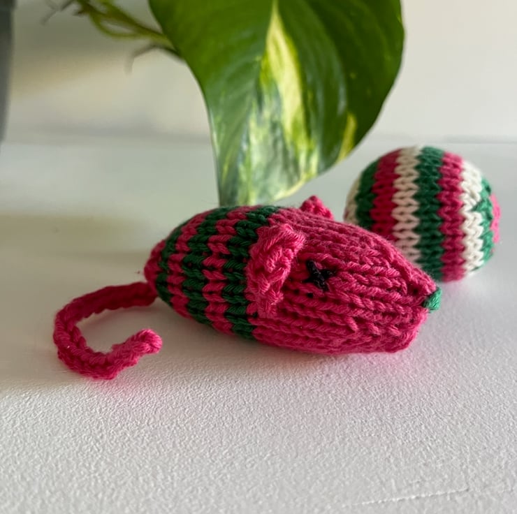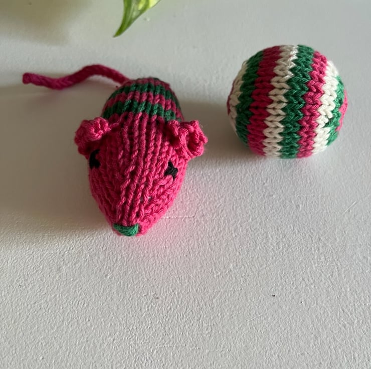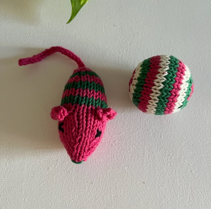 This beautiful hand knitted set includes 1 mouse and 1 ball. Each is made with 100% cotton yarn and filled with recycled polyester filling and a pouch of catnip.