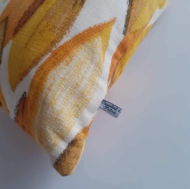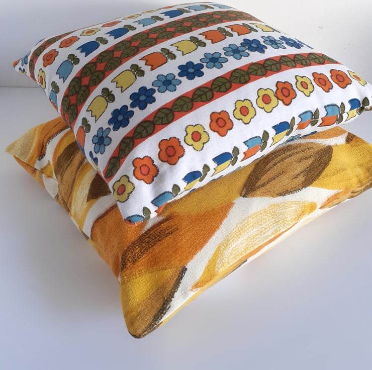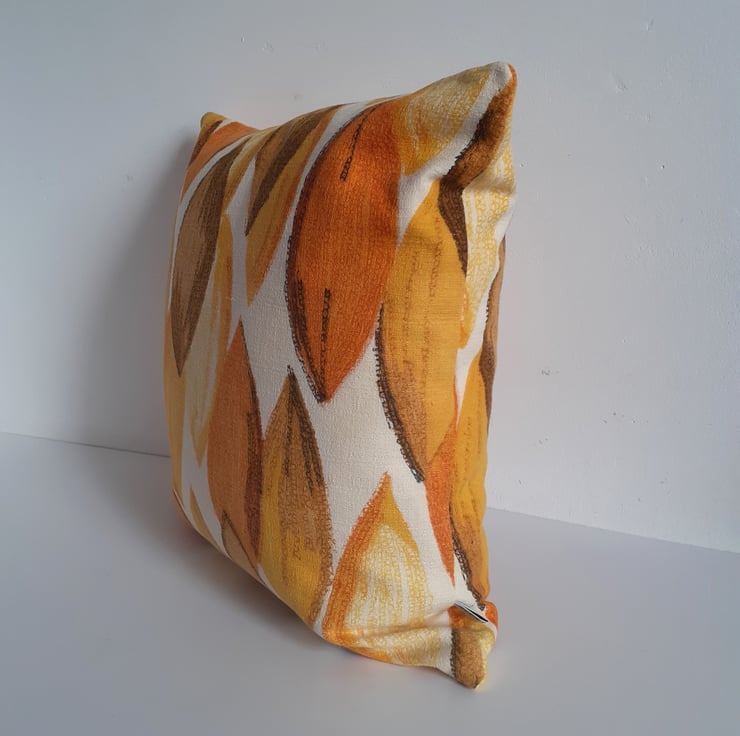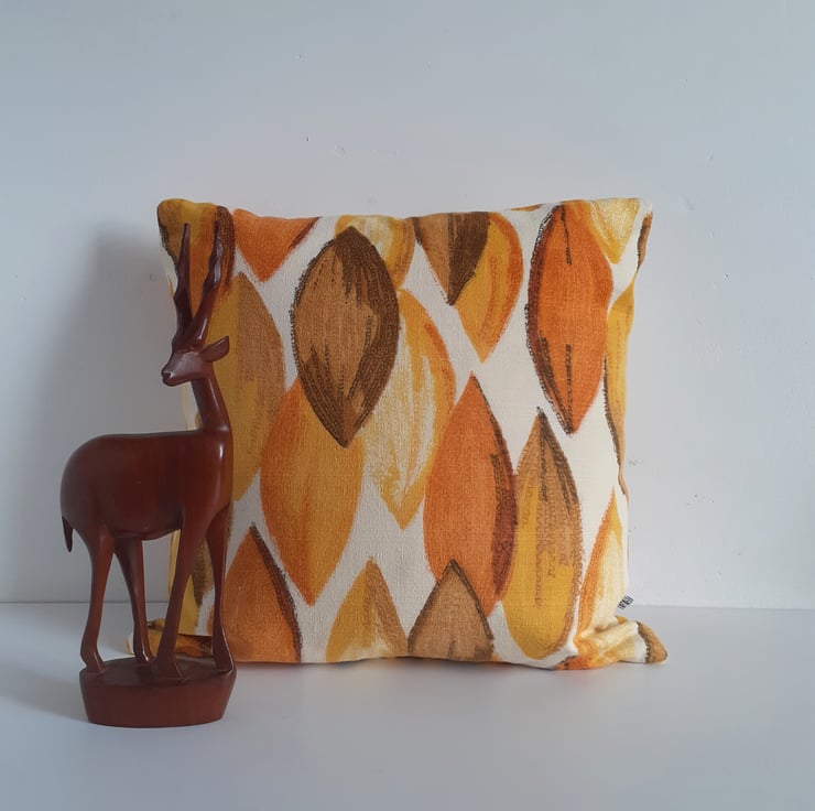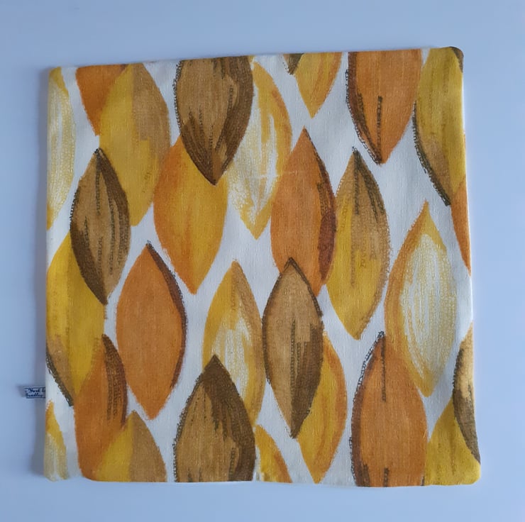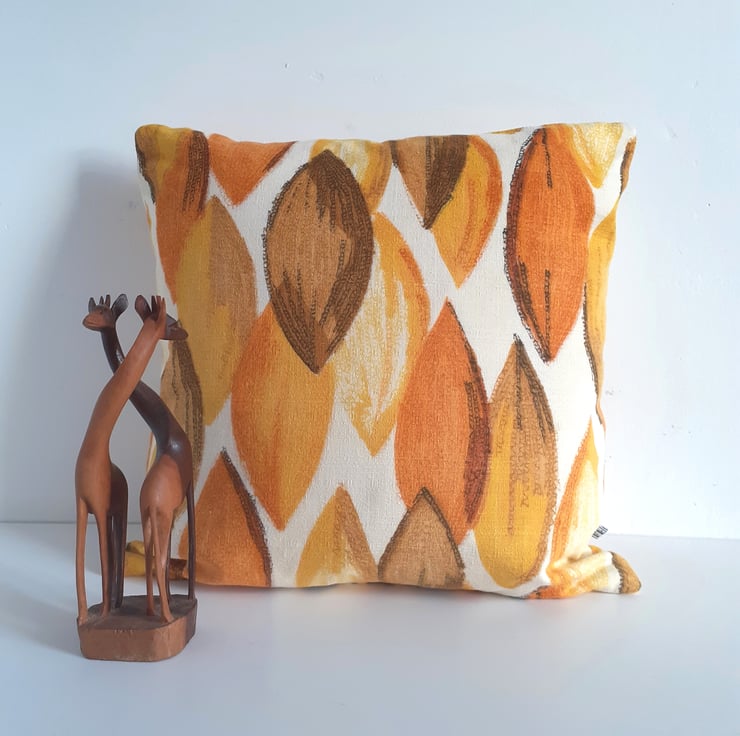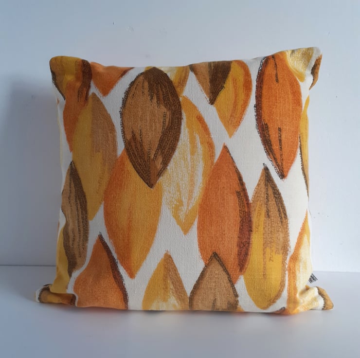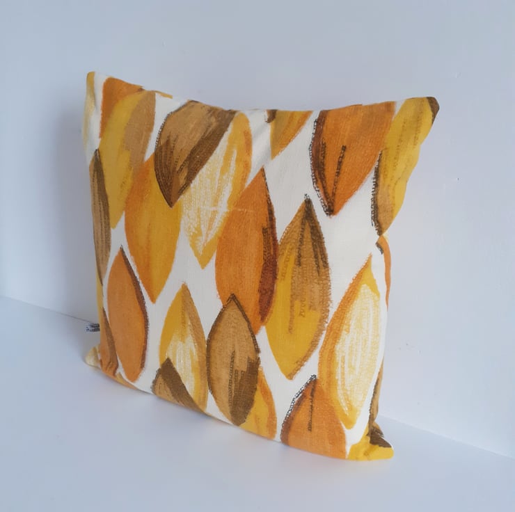 A fabulous bold bark weave cushion cover with a strong vintage print from the 1960s or 70s. The pattern of gold and mustard leaves has a lovely loose, painterly feel, yet still feels up to date. It would look great in mid century styled room.