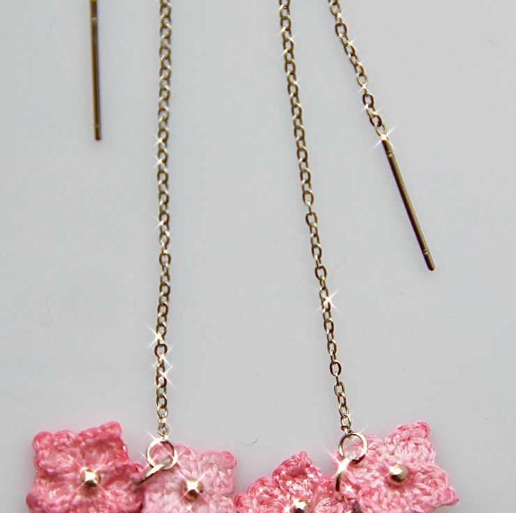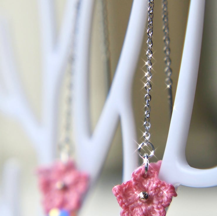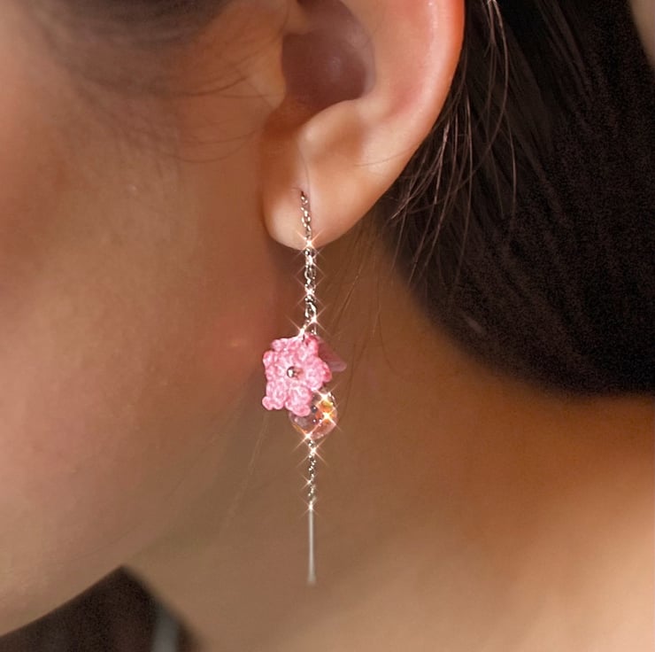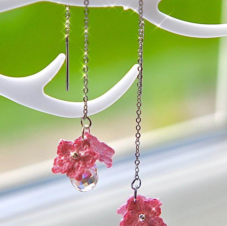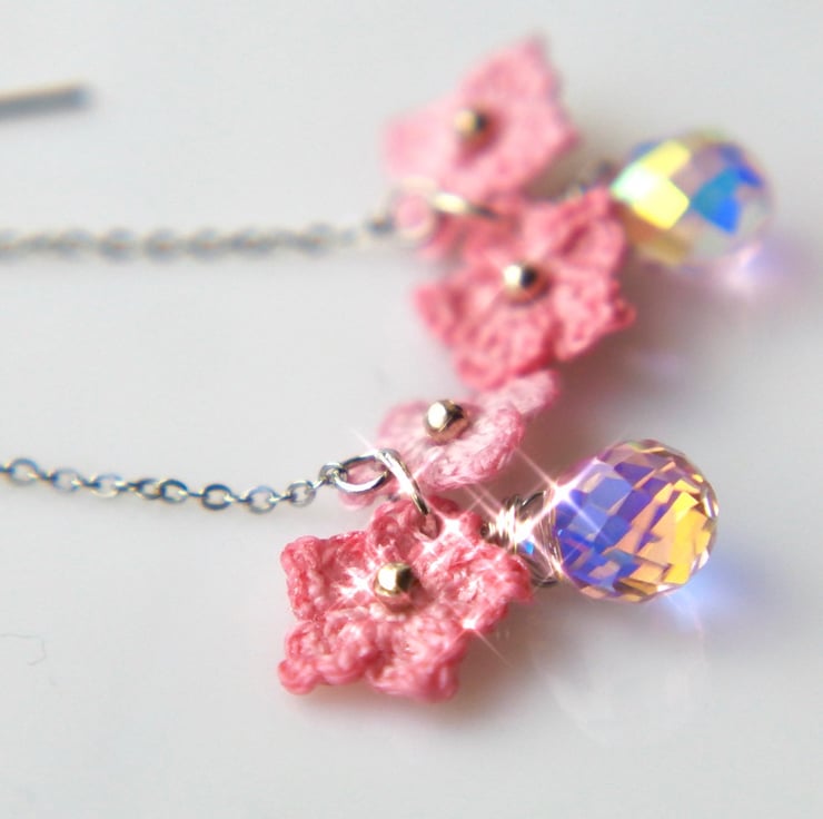 Earrings made with 8x11mm Pink Glass Crystal Water Drop Beads and Embroidery Threads.