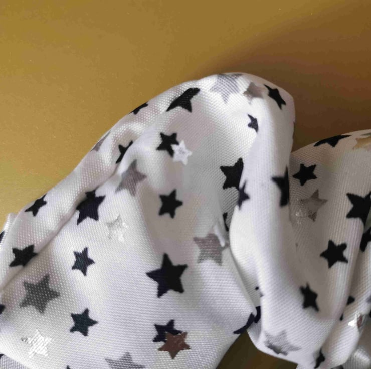 A slightly shiny scrunchie with black, grey and silver stars. Fit for a party!