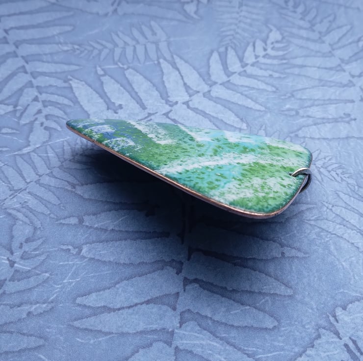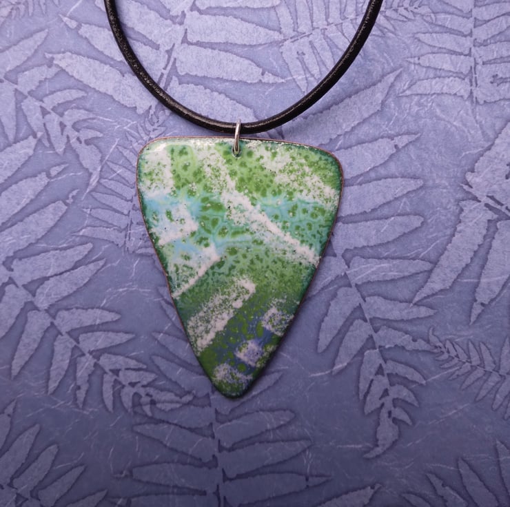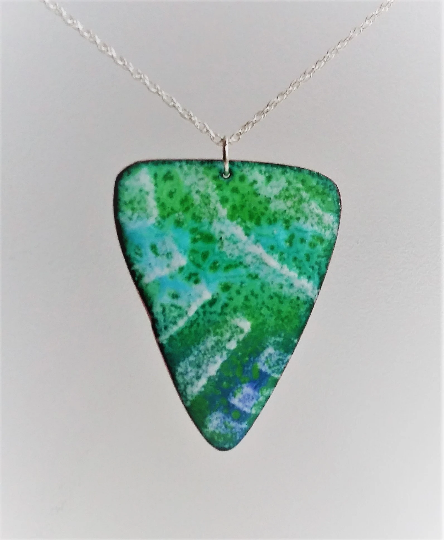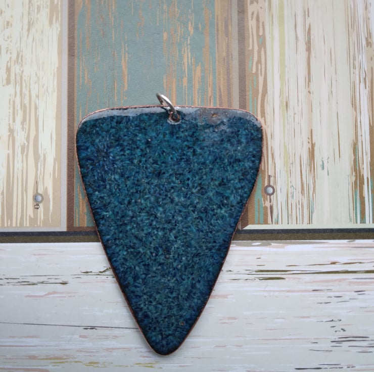 Hand-cut, triangular copper pendant with rounded edges, in shades of green, blue and white on recycled copper. The pendant has been kiln-fired and measures approximately 50mm in length and 33mm across the wides part (top). To complete the piece aesthetically and for a smooth finish against the skin, the back has been given two coats of dark blue tweed-effect enamel. It comes complete with a soldered sterling silver jump ring (6mm) and is supplied with a little organza pouch. An 18” sterling silver rope chain, or a 2mm leather cord (selection of lengths) finished with a magnetic clasp, can be purchased separately from my shop if needed – please see separate listings. If you are using your own chain, please ensure that it will fit through the 6mm jump ring, allowing for the thickness of the pendant.