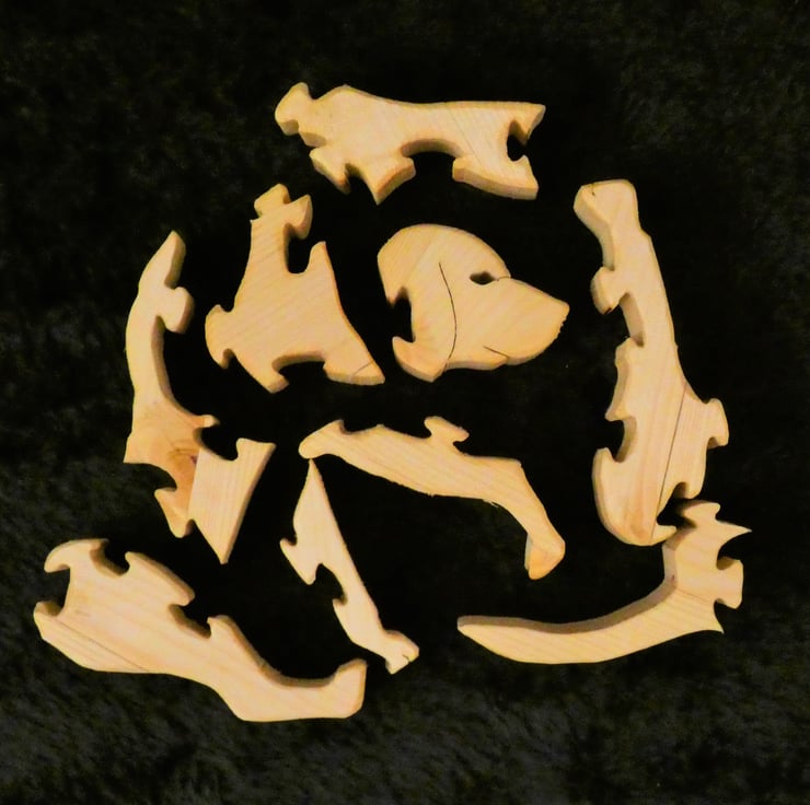 To make this jigsaw I firstly glued several pieces of wood together and when dry cut it to a suitable size. I then sanded it to produce a smooth finish. The design was applied to the wood and cut using a Scroll Saw. The puzzle was then assembled and disassembled to ensure that all the pieces fitted together smoothly. Each piece was lightly sanded all around to give them a slight round over effect. It was then coated in Danish Oil and buffed to a smooth finish.