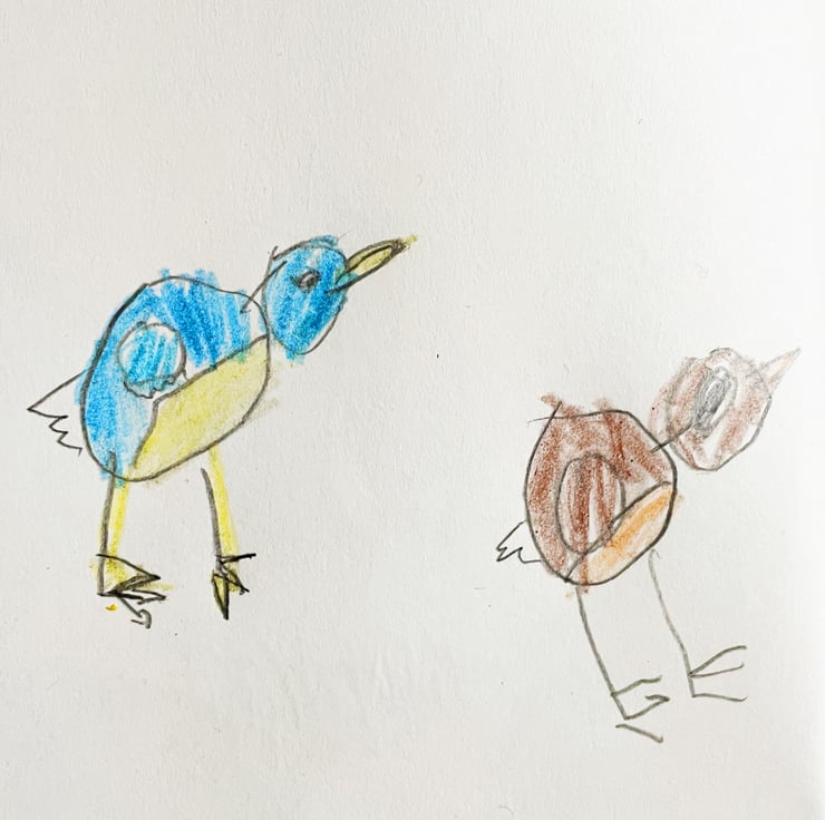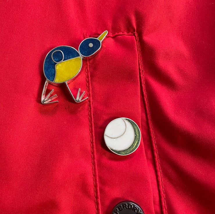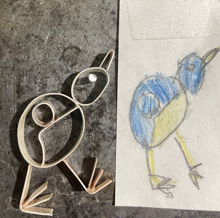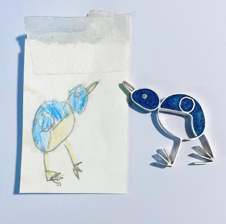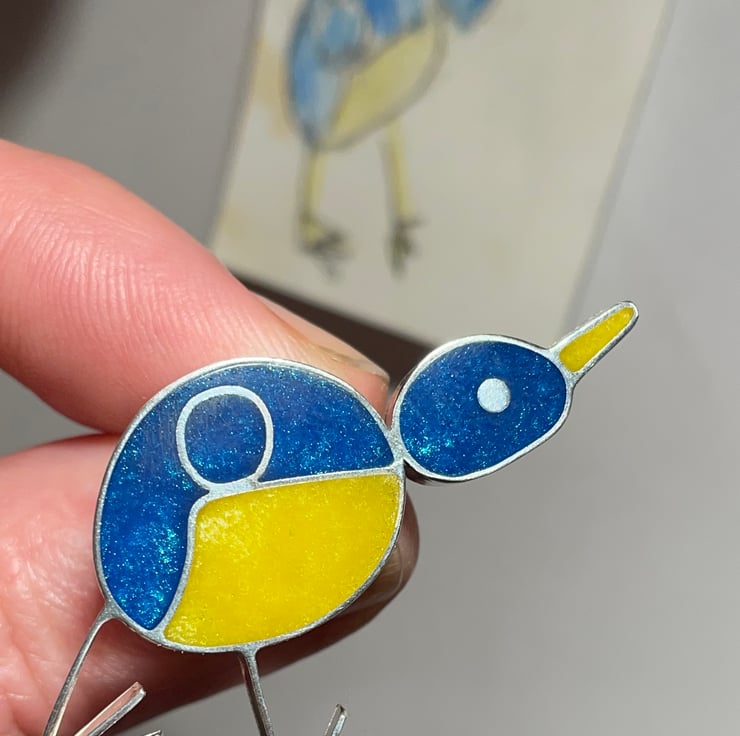 This sterling silver and resin brooch is handmade from a Childs drawing of a blue tit.