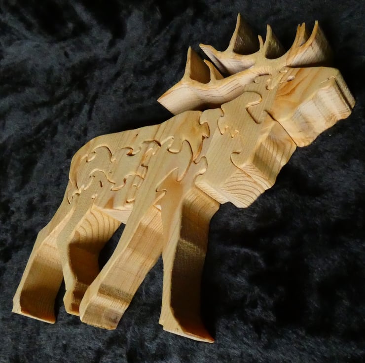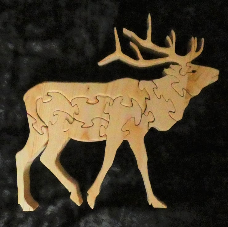 To make this jigsaw I firstly glued several pieces of wood together and when dry, cut it to a suitable size. I then sanded it to produce a smooth finish. The design was applied to the wood and cut using a Scroll Saw. The puzzle was then assembled and disassembled to ensure that all the pieces fitted together smoothly. Each piece was lightly sanded all around to give them a slight round over effect. It was then coated in Danish Oil and buffed to a smooth finish.
