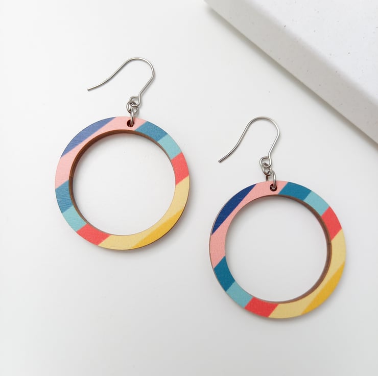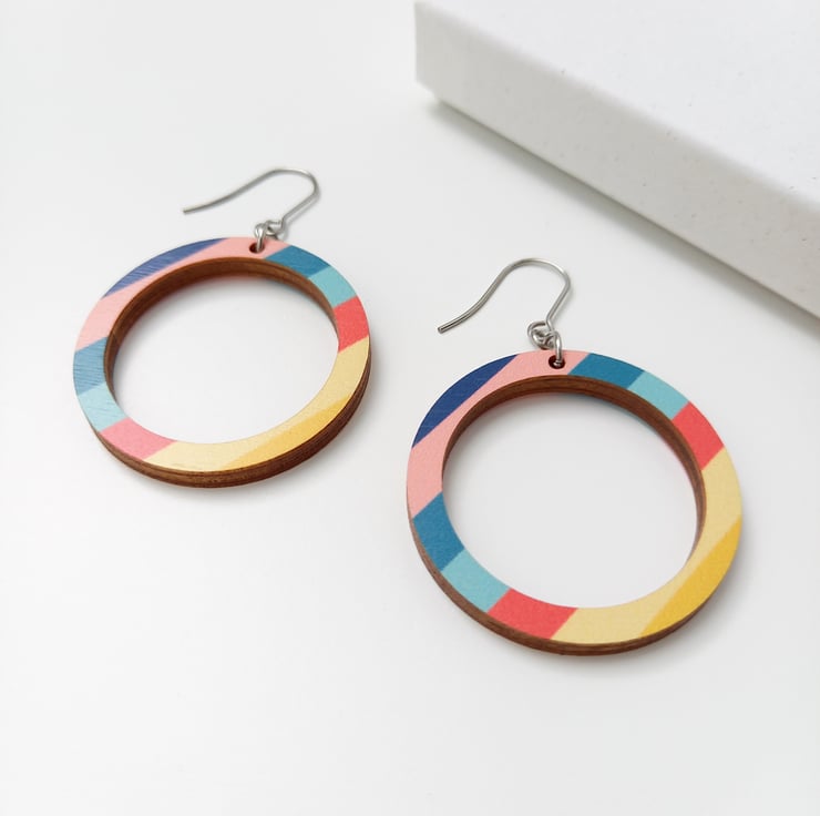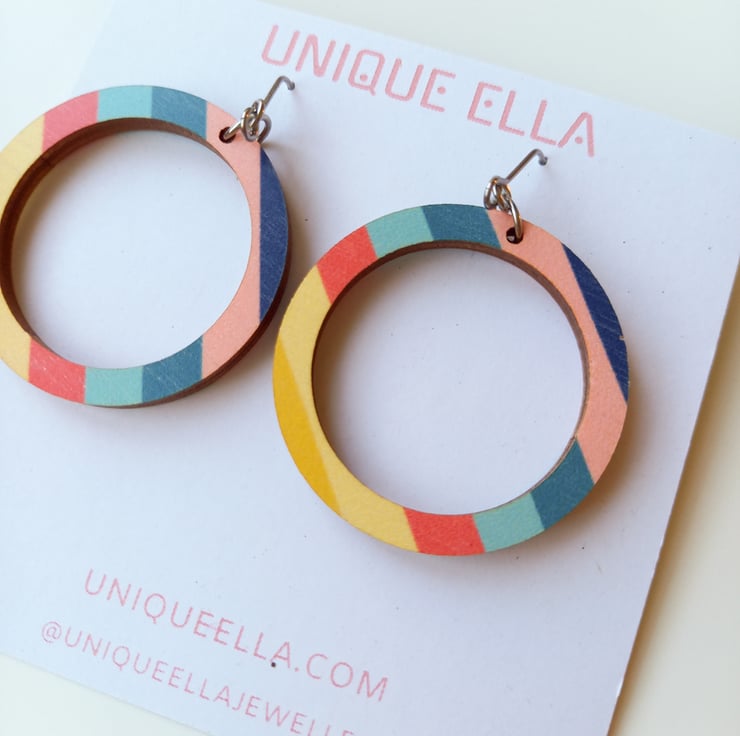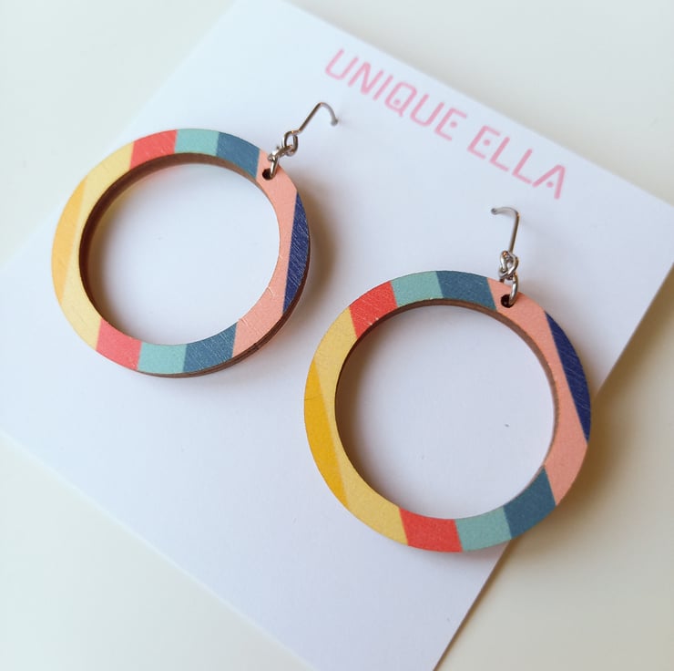 All my earrings are laser cut from high quality PEFC & FSC certified Finnish birch plywood. The wooden parts are printed with an odourless and ecological printing ink and finished with varnish. The surface of the wood is highly resistant to UV rays.
