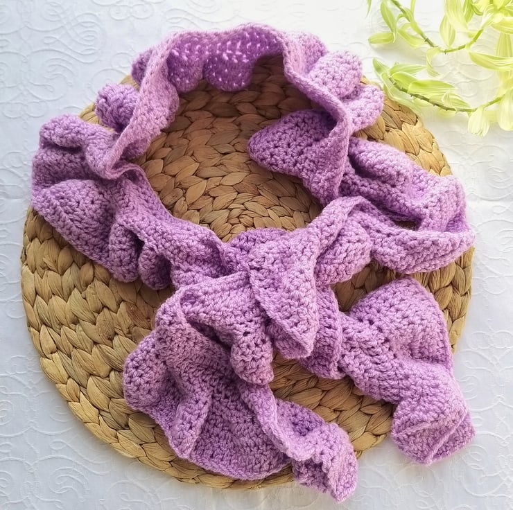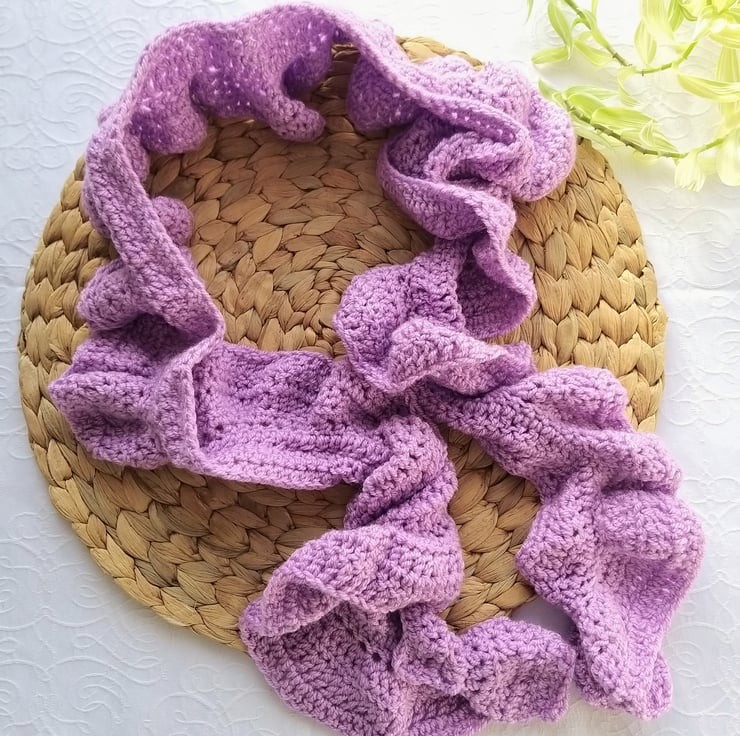 In a luxurious soft merino blend yarn this Lilac scarf has a frilled edging and is perfect wearing with a coat or jacket or just to brighten up a top.