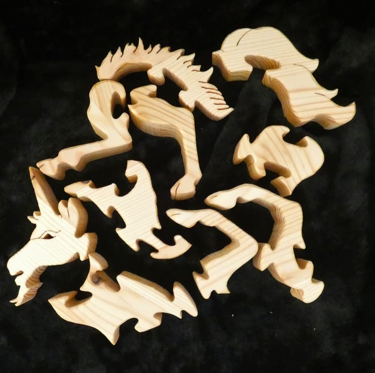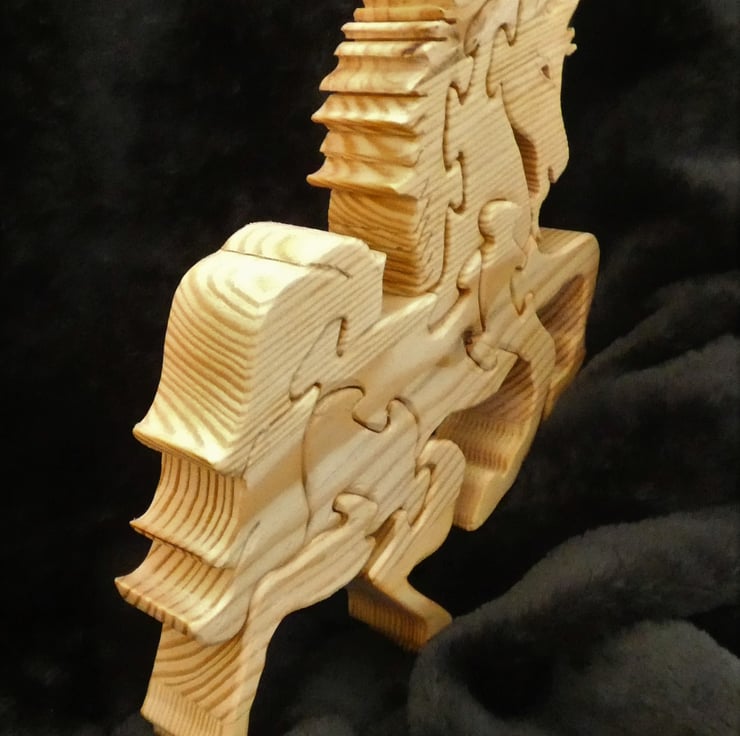 To make this jigsaw I firstly glued several pieces of wood together and when dry, cut it to a suitable size. I then sanded it to produce a smooth finish. The design was applied to the wood and cut using a Scroll Saw. The puzzle was then assembled and disassembled to ensure that all the pieces fitted together smoothly. Each piece was lightly sanded all around to give them a slight round over effect. It was then coated in Danish Oil and buffed to a smooth finish.