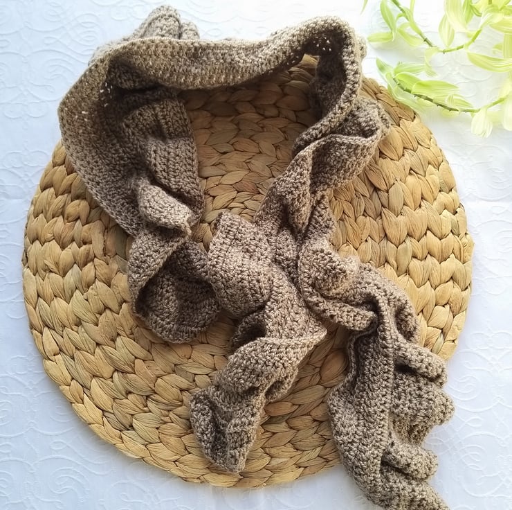 In a scrumptious cookie dough mocha shade of acrylic yarn this scarf has a frilled edging and is perfect wearing with a coat or jacket or just to brighten up a top.