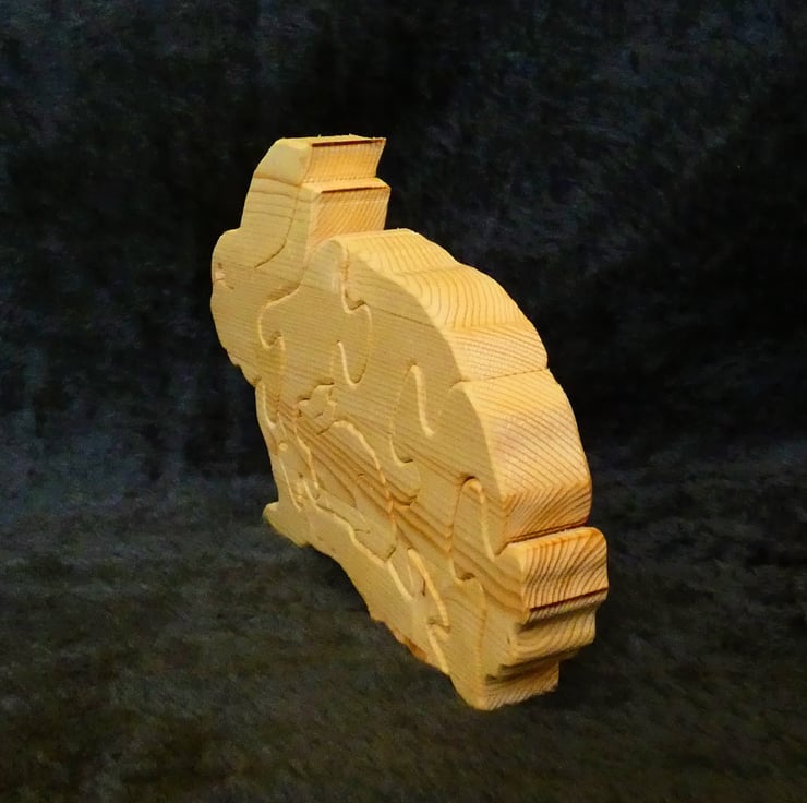 To make this jigsaw I firstly glued several pieces of wood together and when dry, cut it to a suitable size. I then sanded it to produce a smooth finish. The design was applied to the wood and cut using a Scroll Saw. The puzzle was then assembled and disassembled to ensure that all the pieces fitted together smoothly. Each piece was lightly sanded all around to give them a slight round over effect. It was then coated in Danish Oil and buffed to a smooth finish.