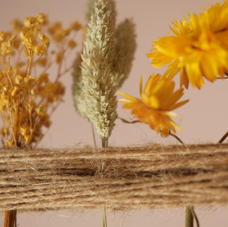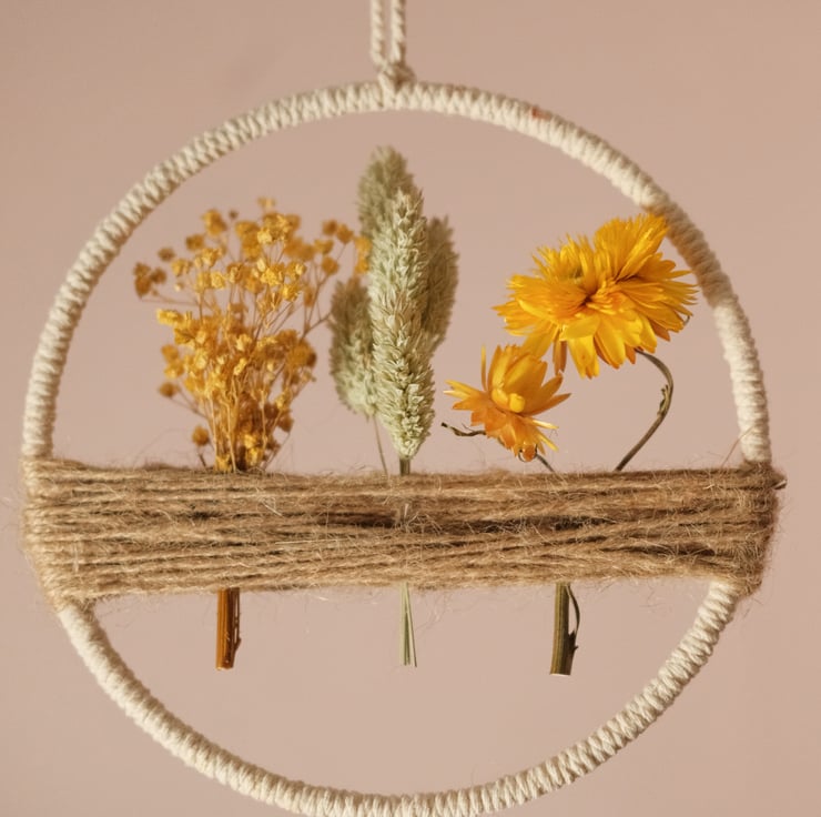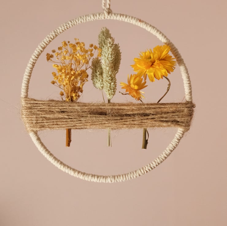 Hoop wall hanging with 3 bunches of yellow/natural coloured dried flowers encased in twine.