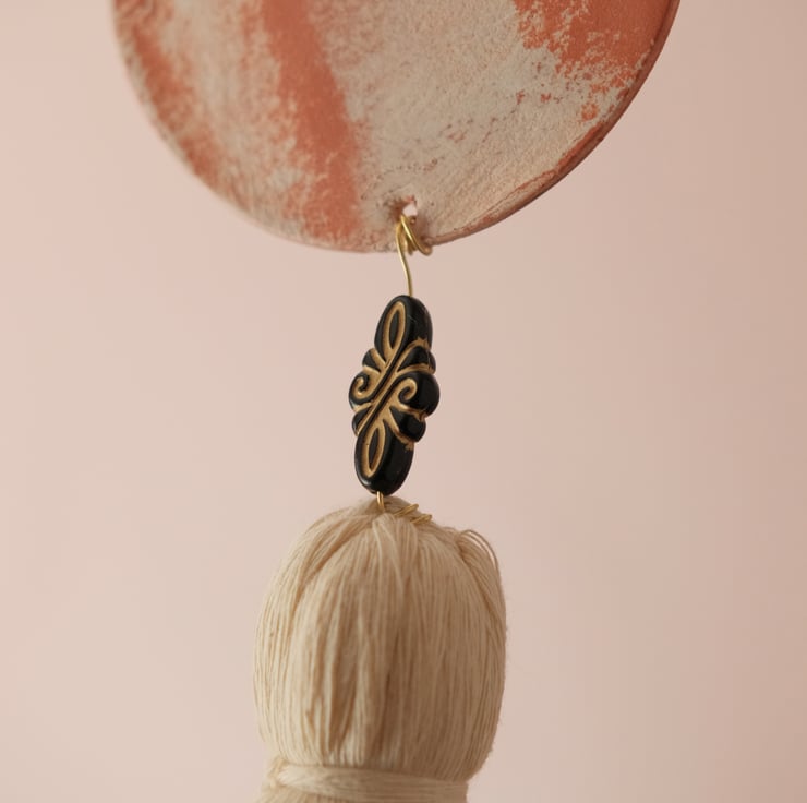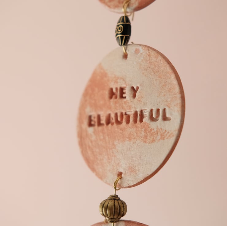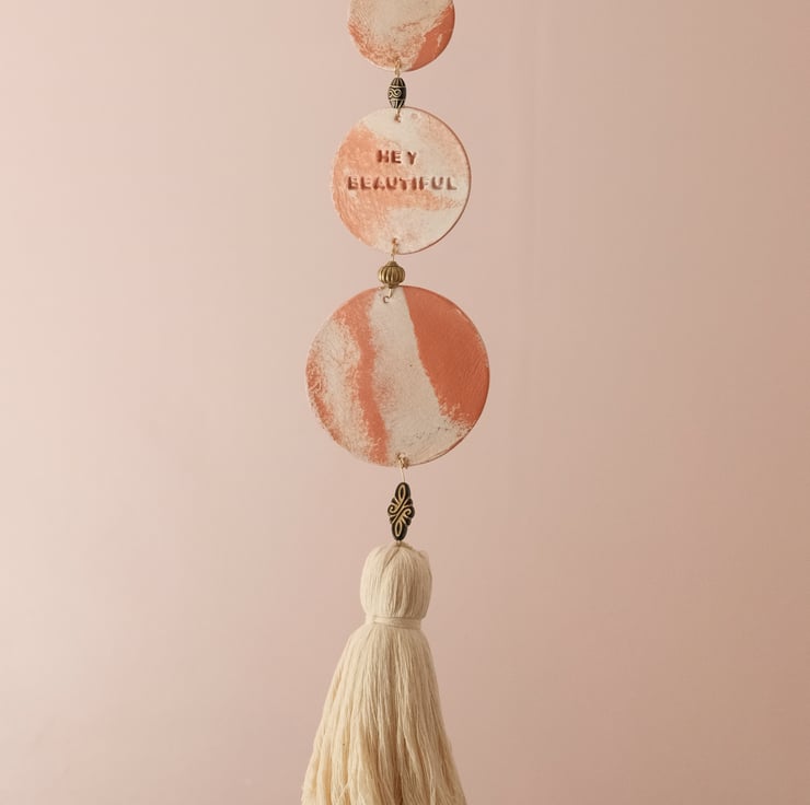 Terracotta and off white marbled clay wall hanging. Comprised of three sizes of clay discs, one with embossed 'HEY BEAUTIFUL' wording.