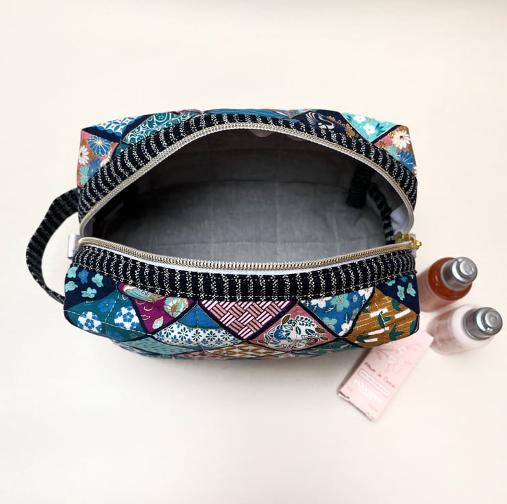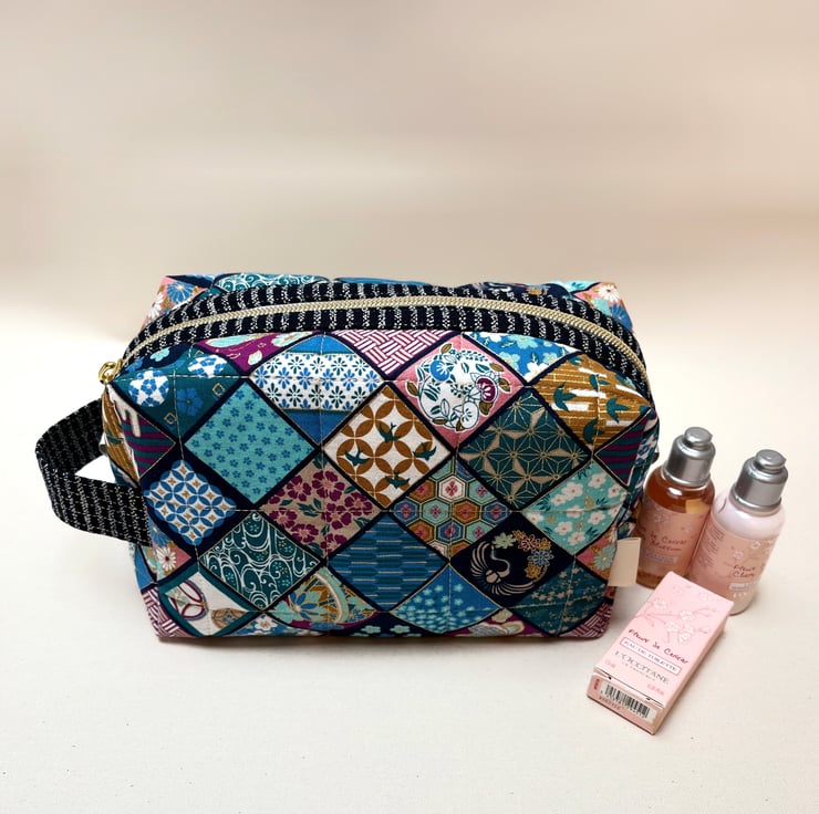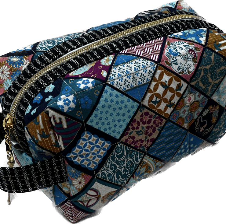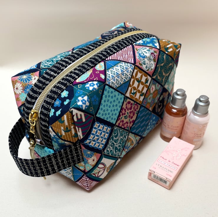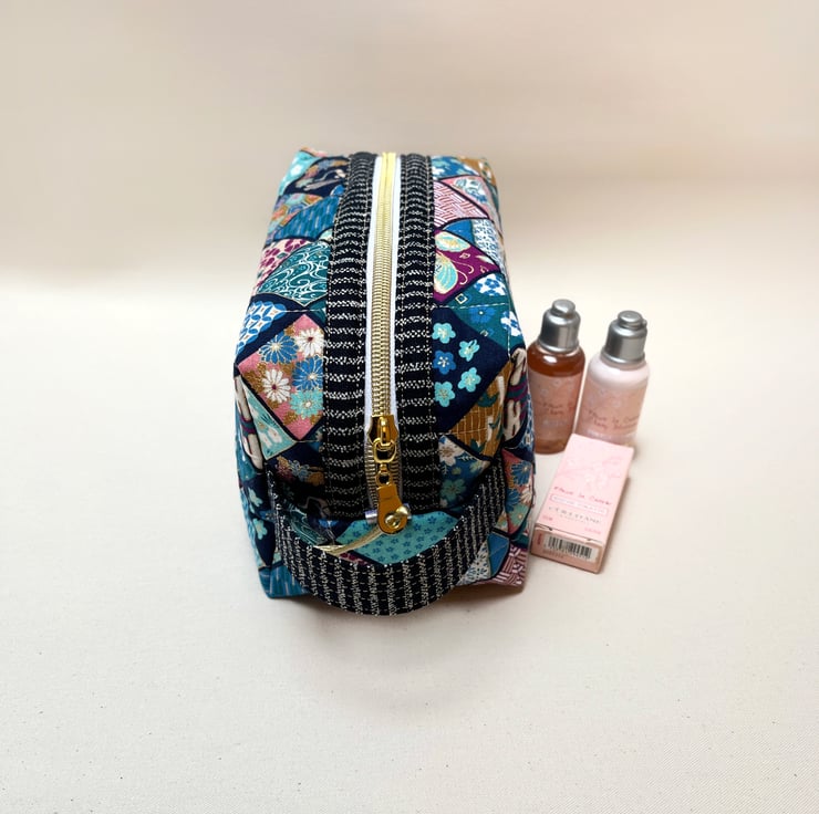 A gorgeous teal Japanese fabric depicting traditional patterns in small squares has been used to craft this cosmetic bag or wash bag with a gold metal donut zip pull.
